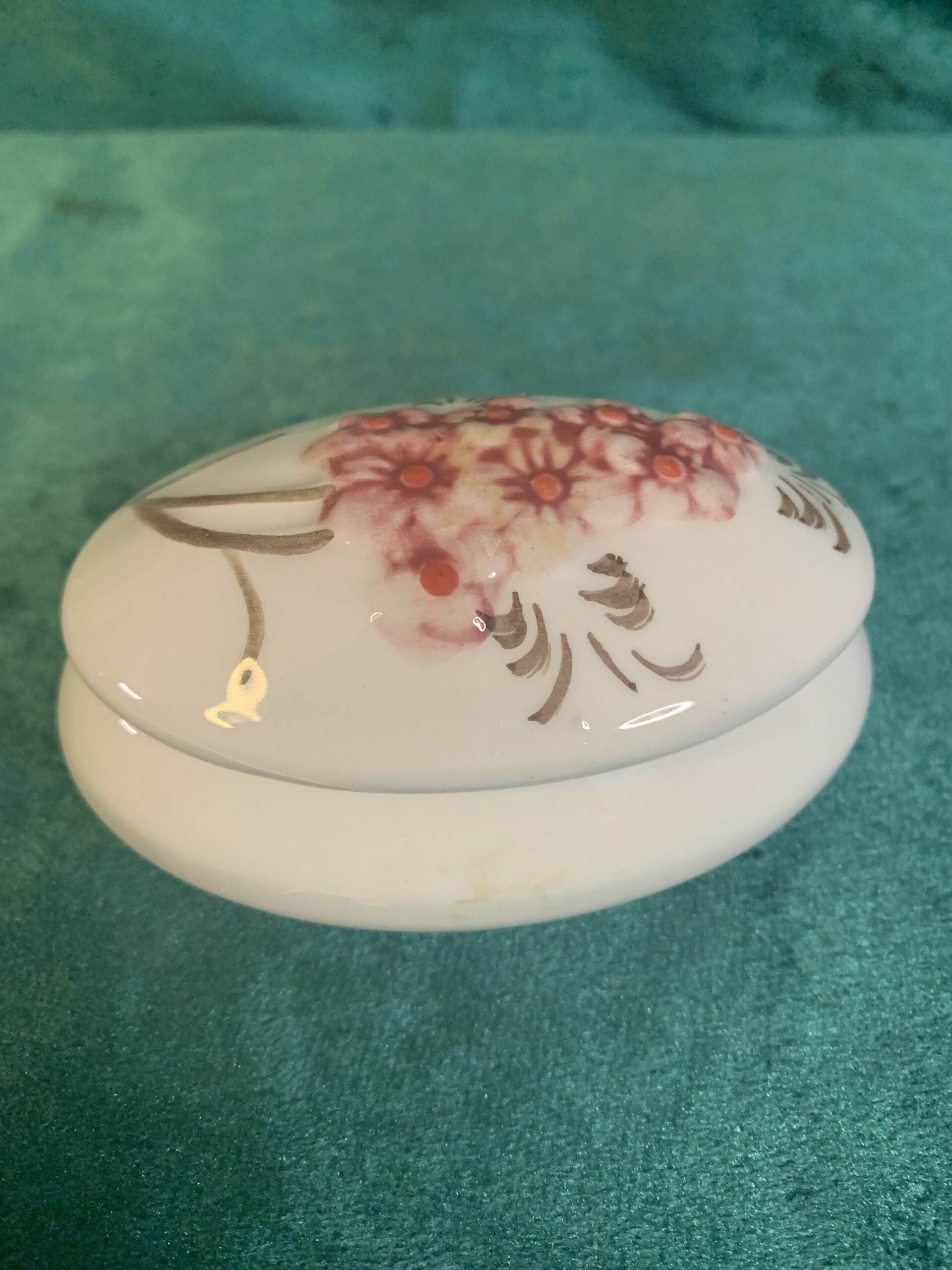 BONITO ALHAJERO PASTILLERO CAJA DE TOCADOR, en porcelana de alta calidad, con un formato ovalado, pintada a mano con motivos florales en relieve sobre la tapa, posiblemente de fabricación asiática a mediados del siglo XX, carece de sellos.