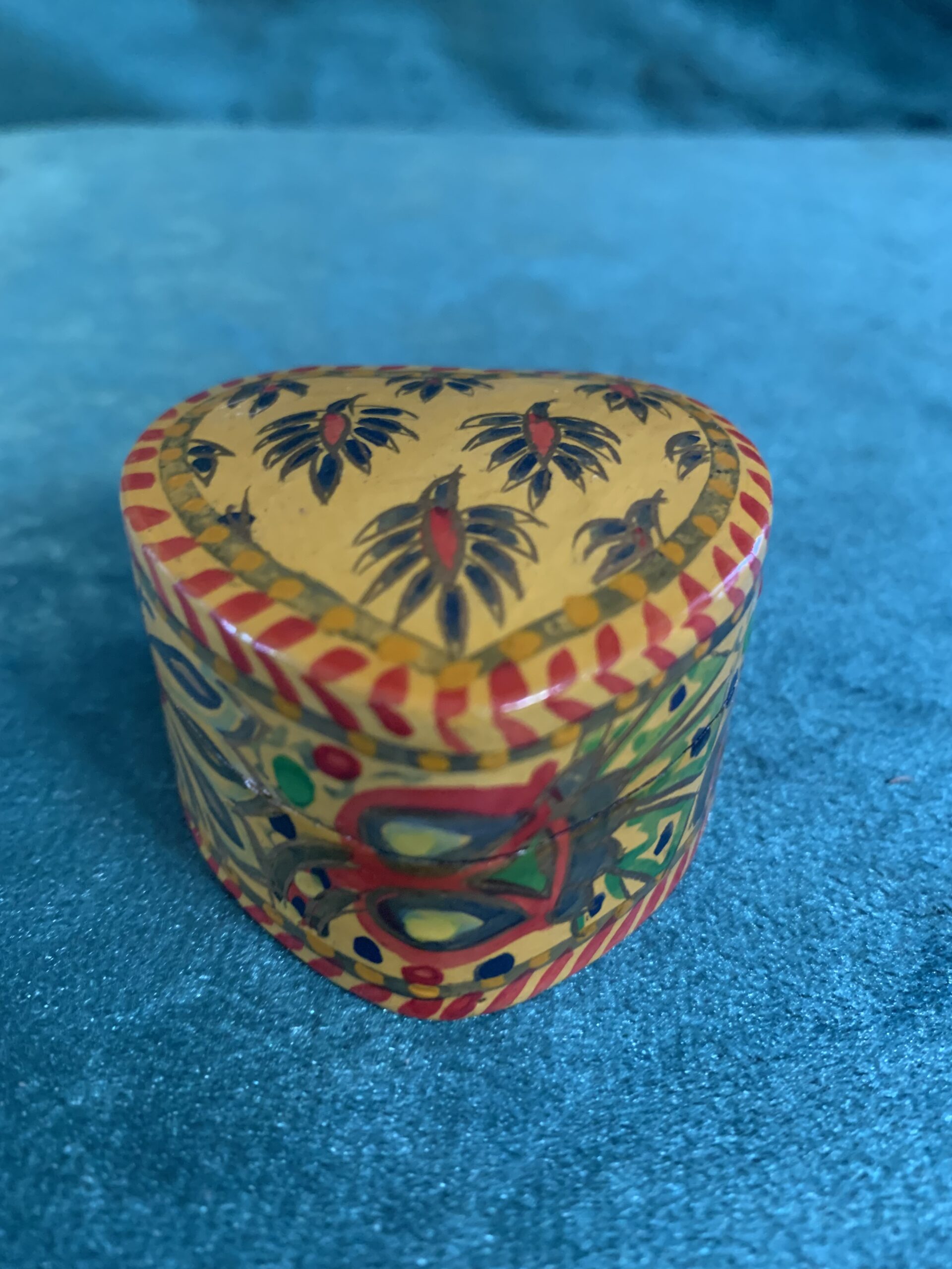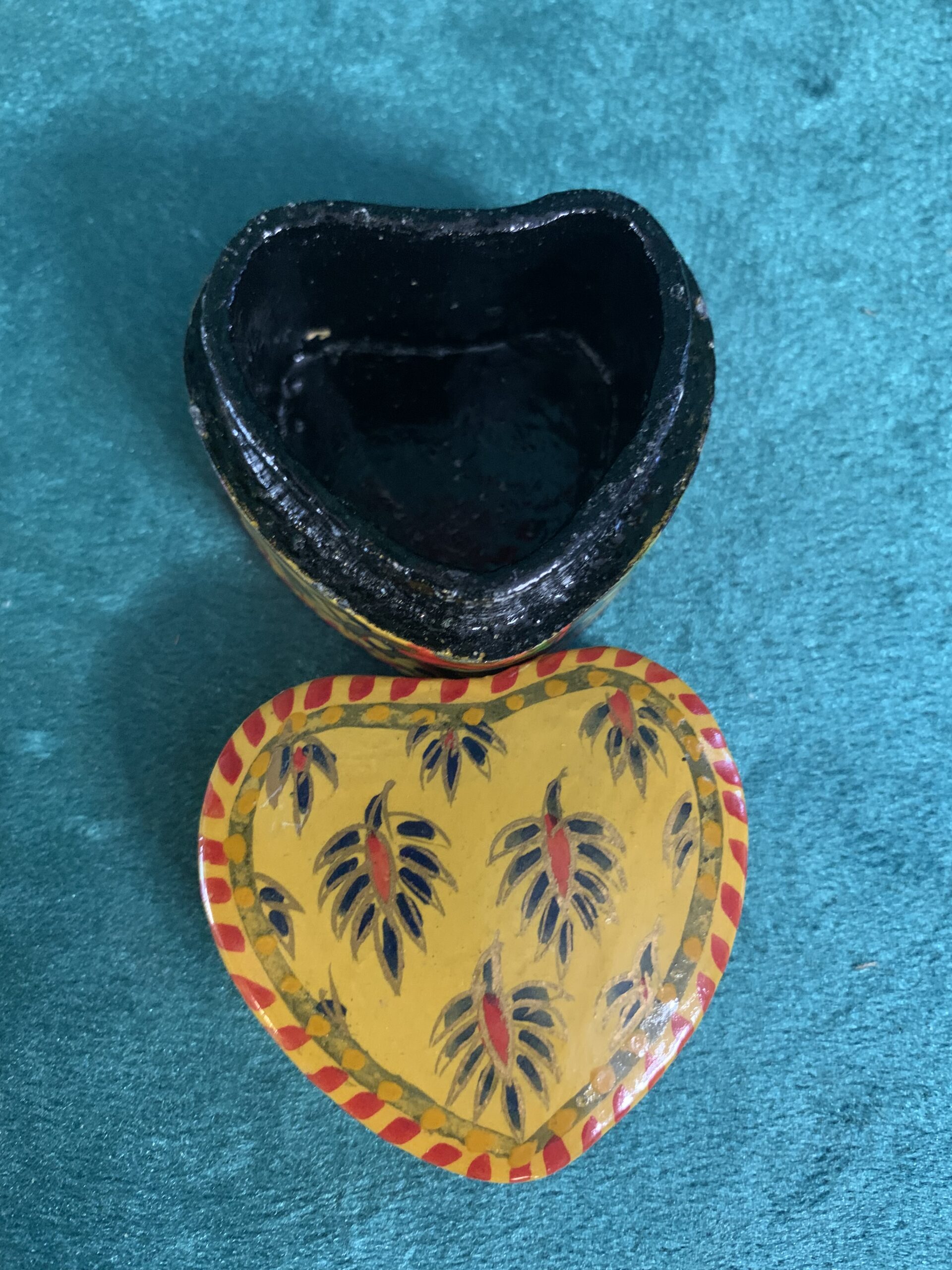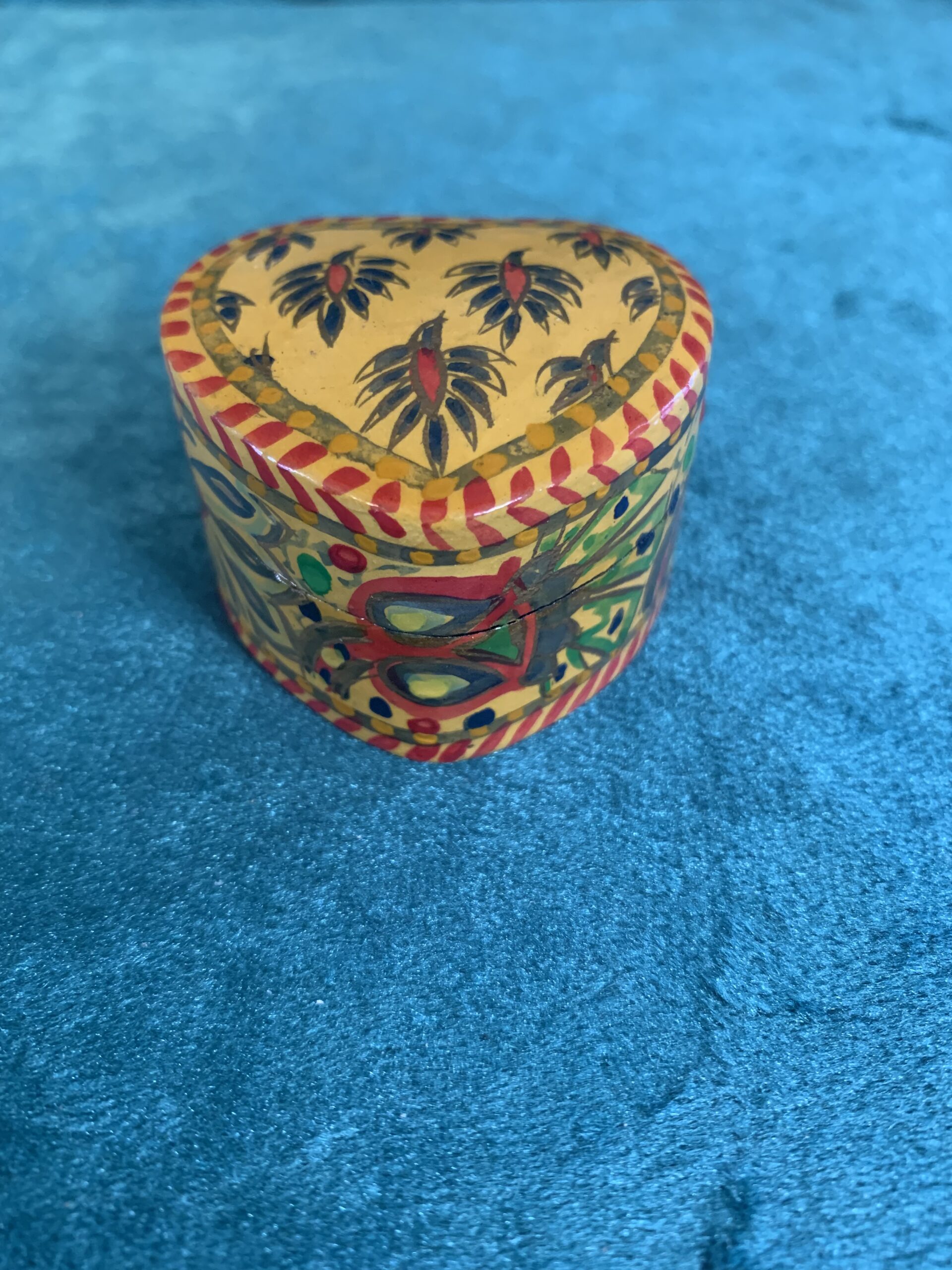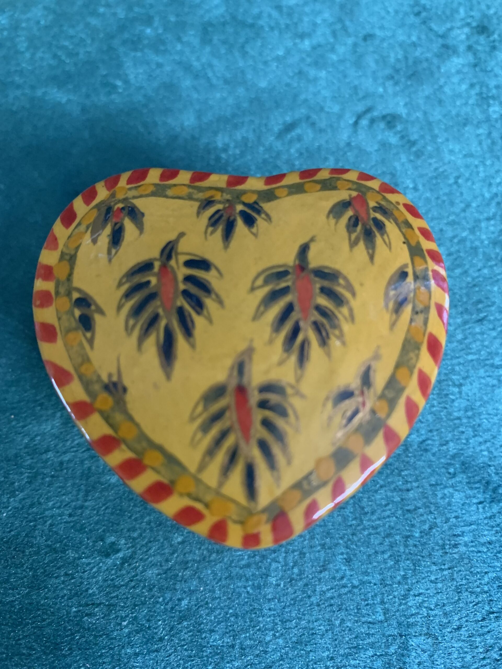 PRECIOSO ALHAJERO PASTILLERO CAJA DE TOCADOR artesanal de la exclusiva marca de decoración Bacara Desing, diseñada en forma de corazón, pintado a mano en policromía con motivos vegetales y animales de estilo modernista, posiblemente de los años 80.