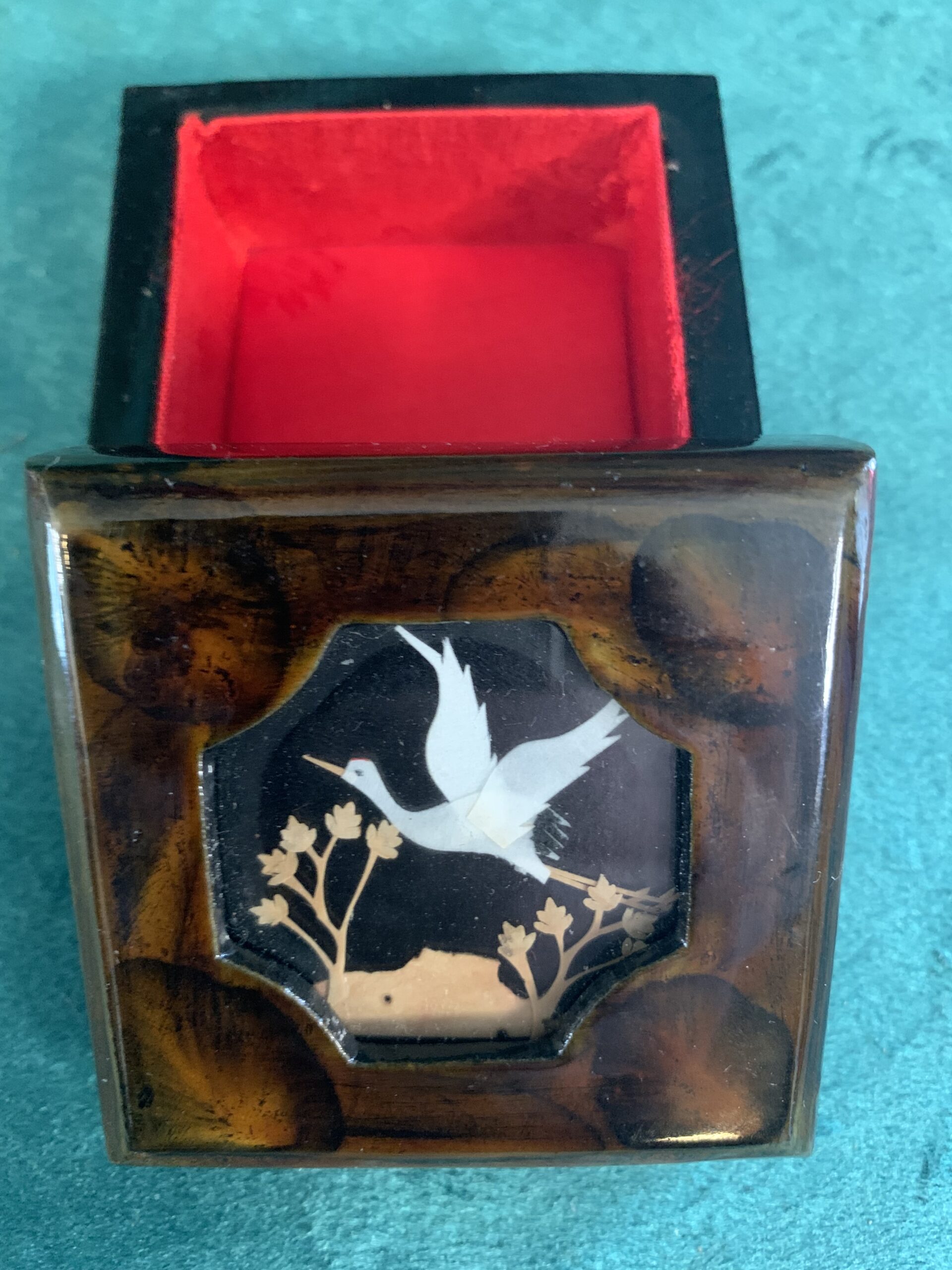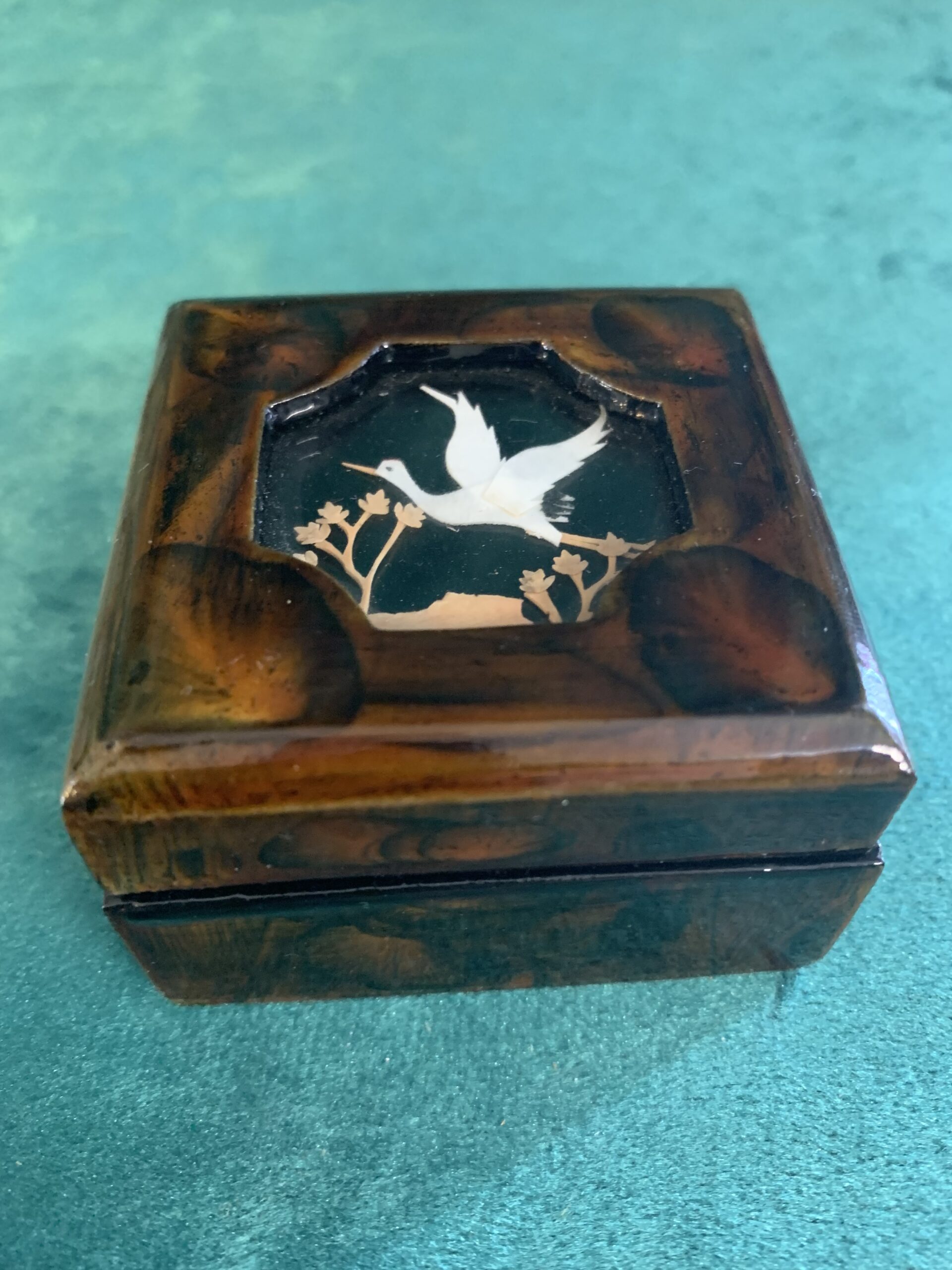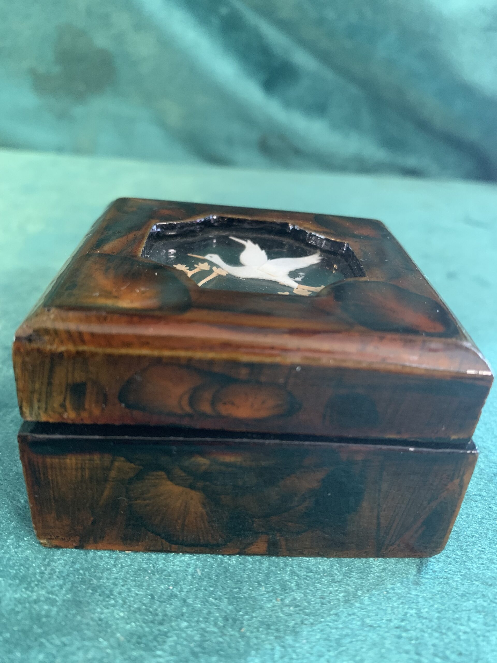 PRECIOSO ALHAJERO PASTILLERO CAJA DE TOCADOR de origen chino, fabricado en madera de Suar lacado, hecho a mano con una diorama en su tapa con una representación de una grulla sobre vegetación, forrado en su interior tanto en la tapa como en su parte inferior, posiblemente de los años 70.