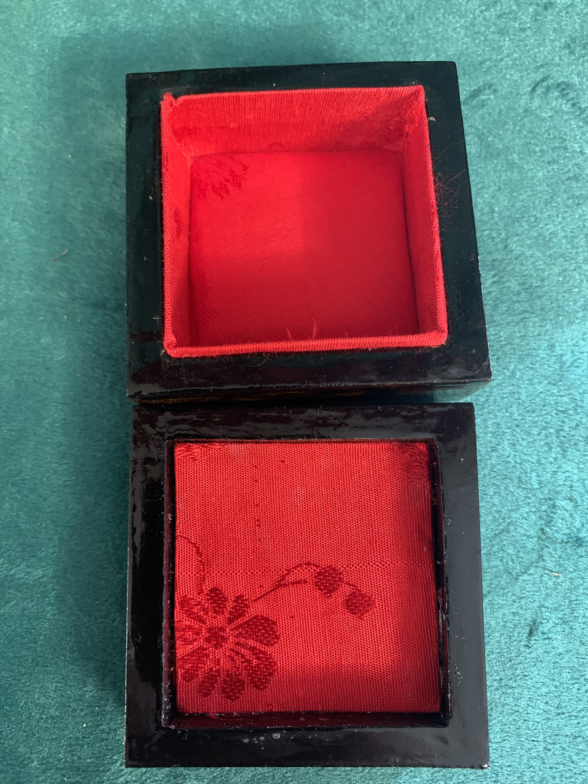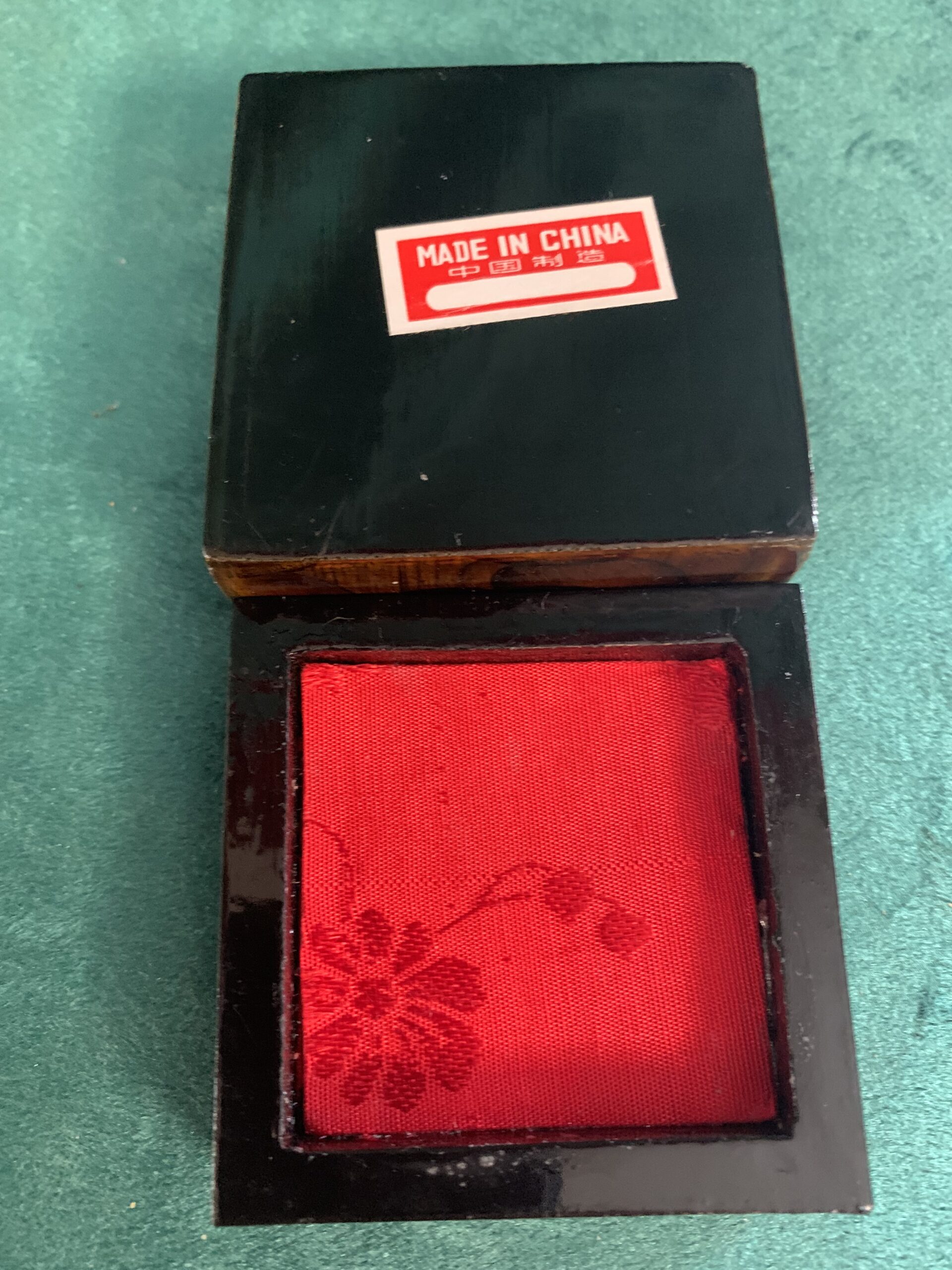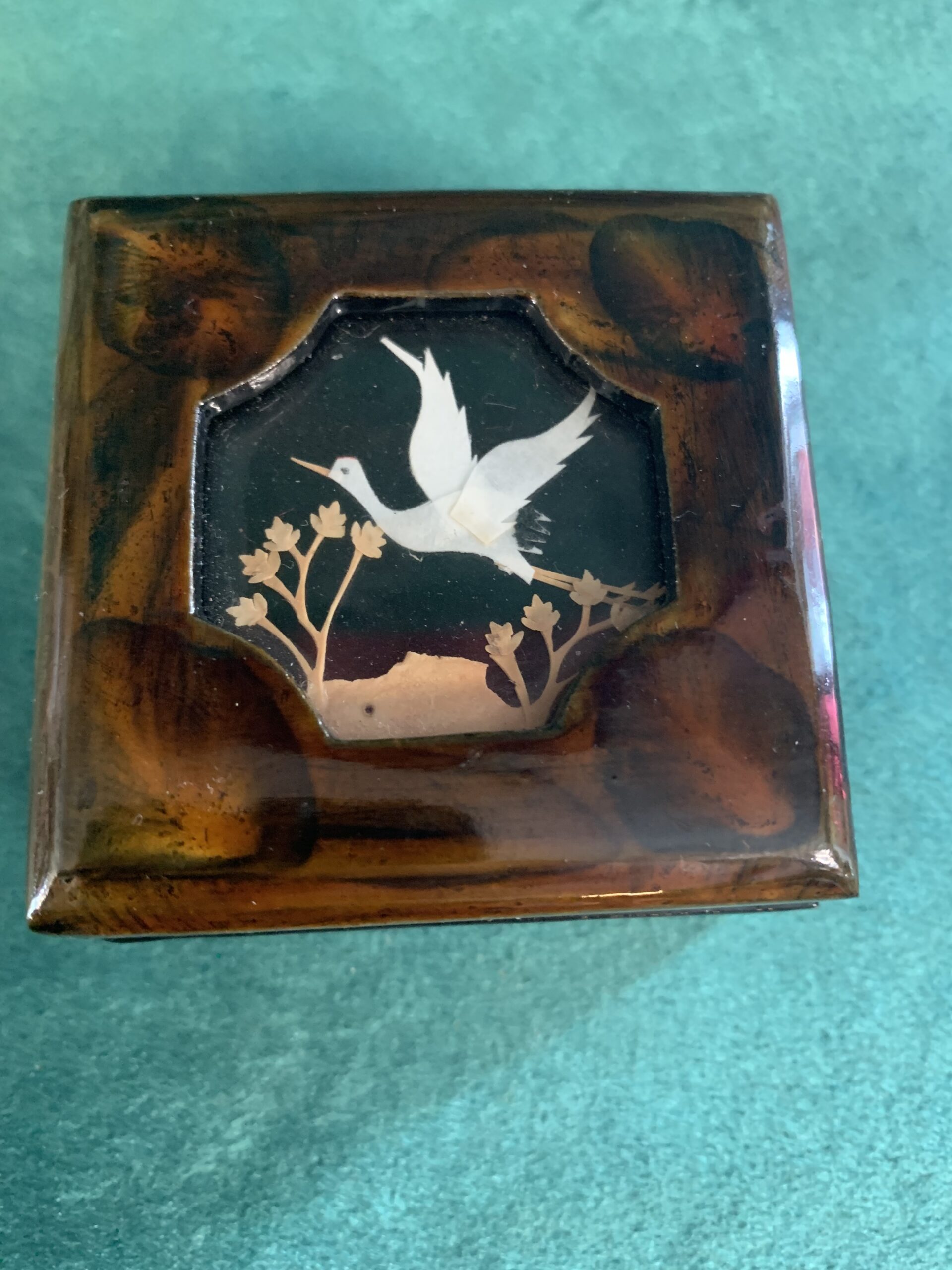 PRECIOSO ALHAJERO PASTILLERO CAJA DE TOCADOR de origen chino, fabricado en madera de Suar lacado, hecho a mano con una diorama en su tapa con una representación de una grulla sobre vegetación, forrado en su interior tanto en la tapa como en su parte inferior, posiblemente de los años 70.