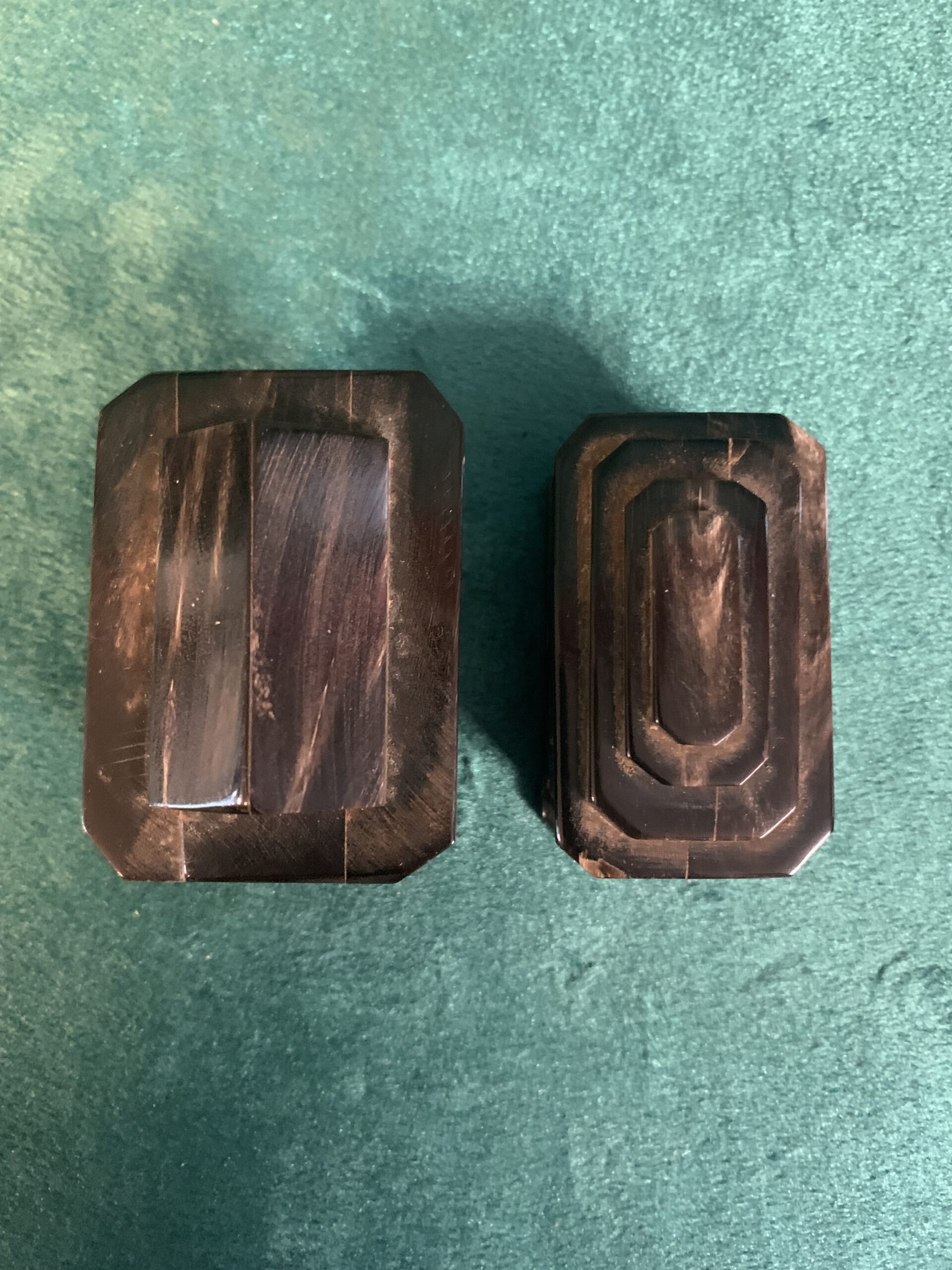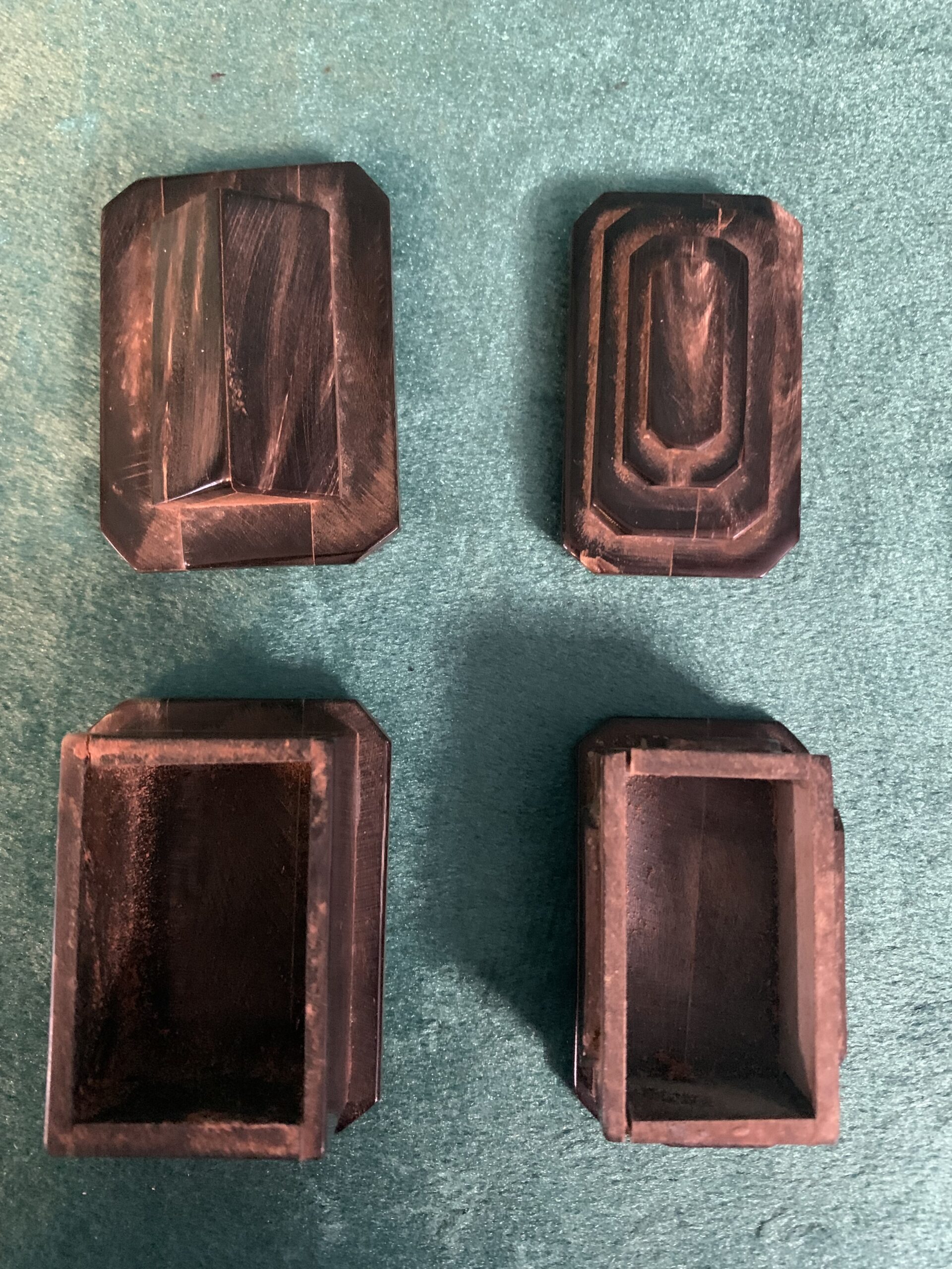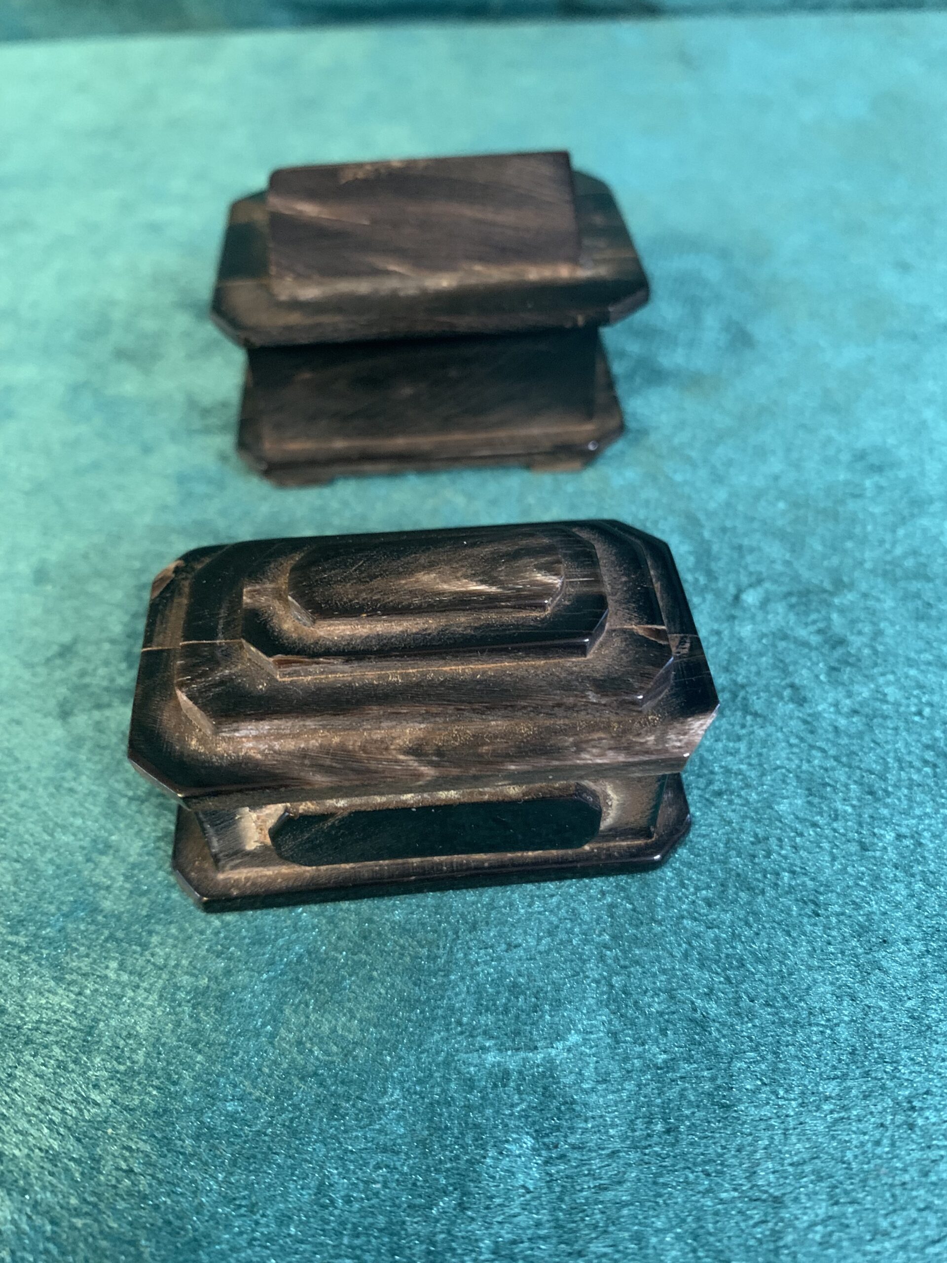 PAREJA DE ALHAJEROS EN MADERA DE EBANO DE GABÓN, pareja de alhajeros, de forma rectangular y tapa piramidal, tallados a mano posiblemente en el Congo, posiblemente años 60.