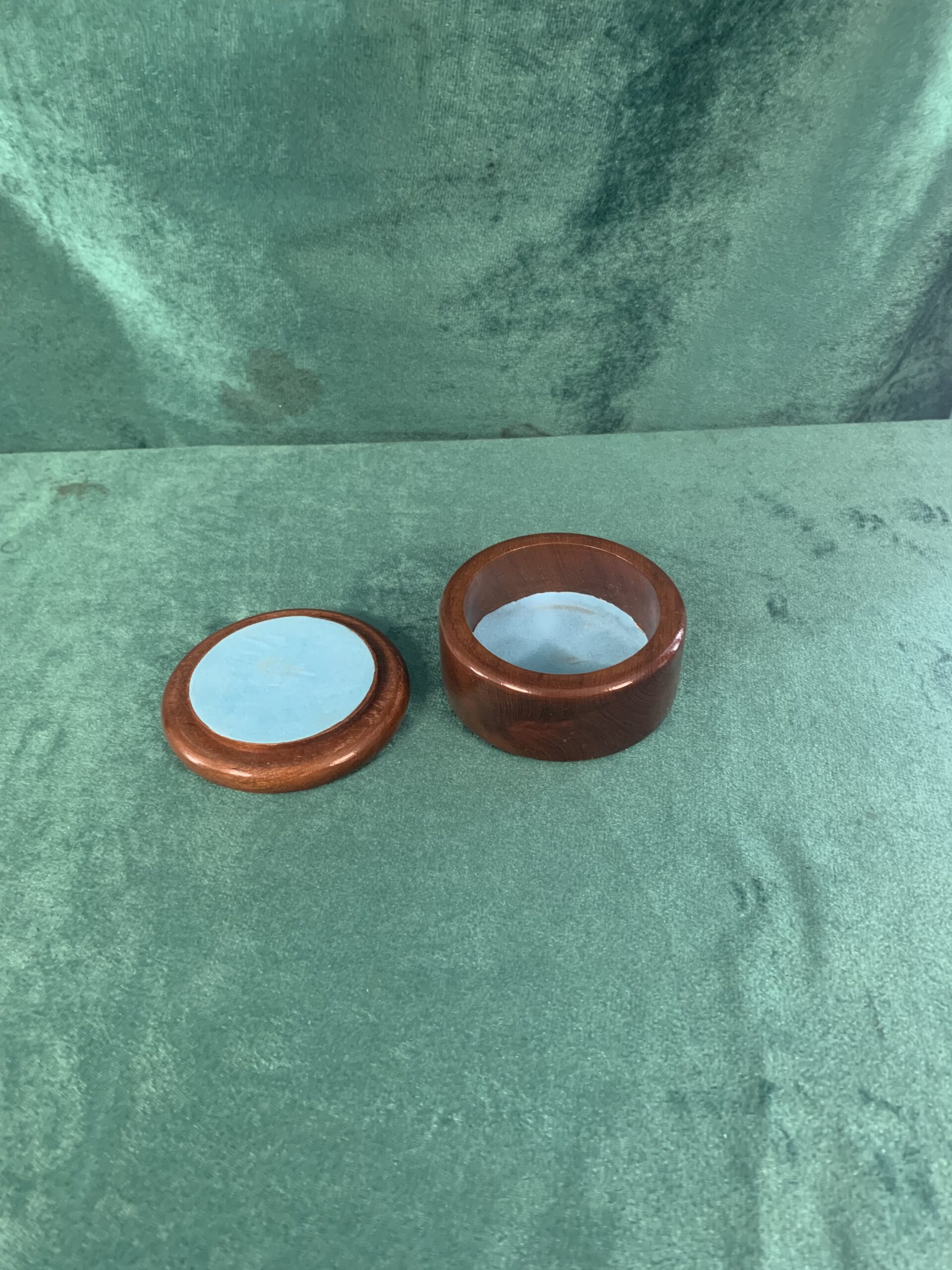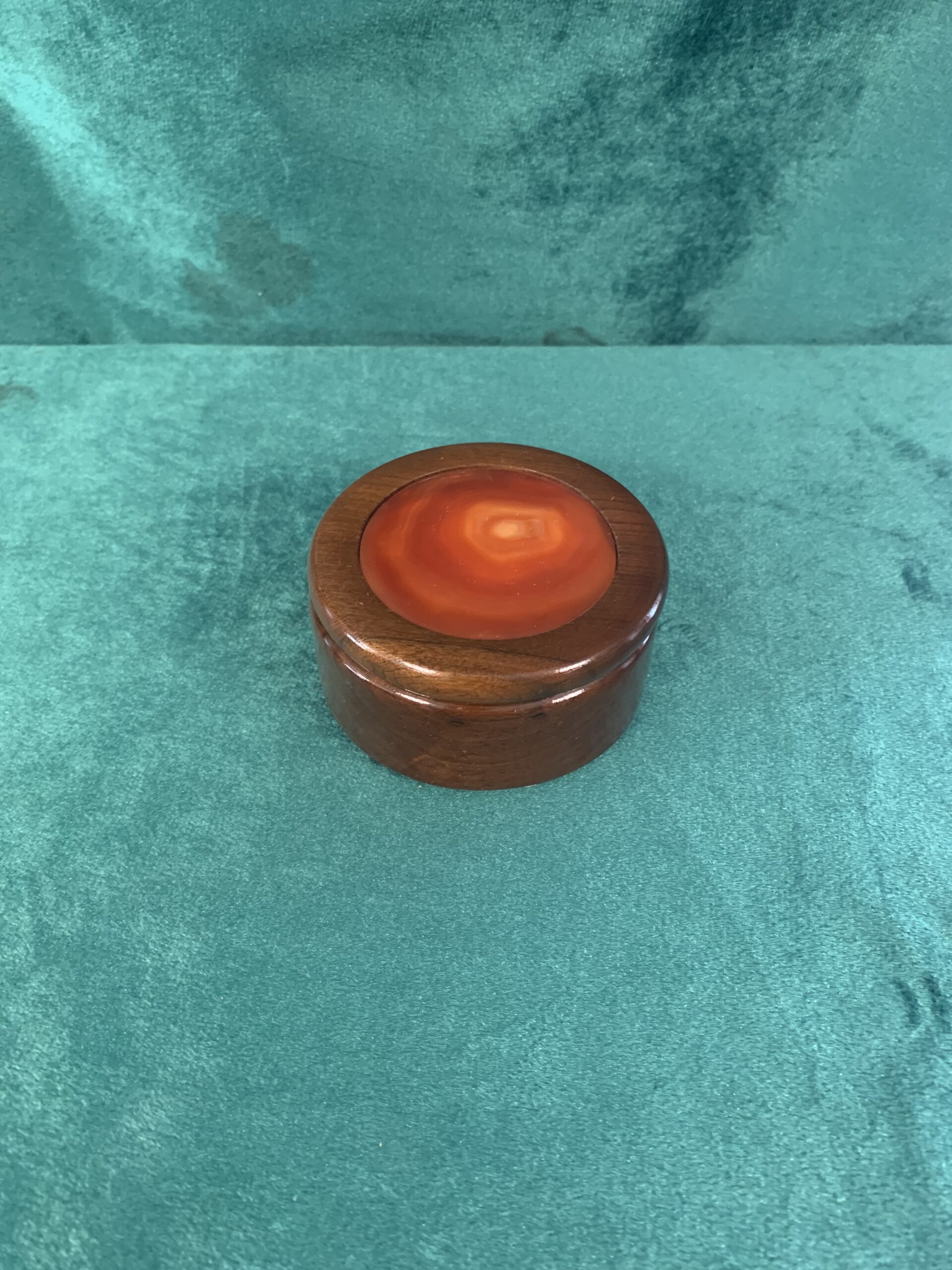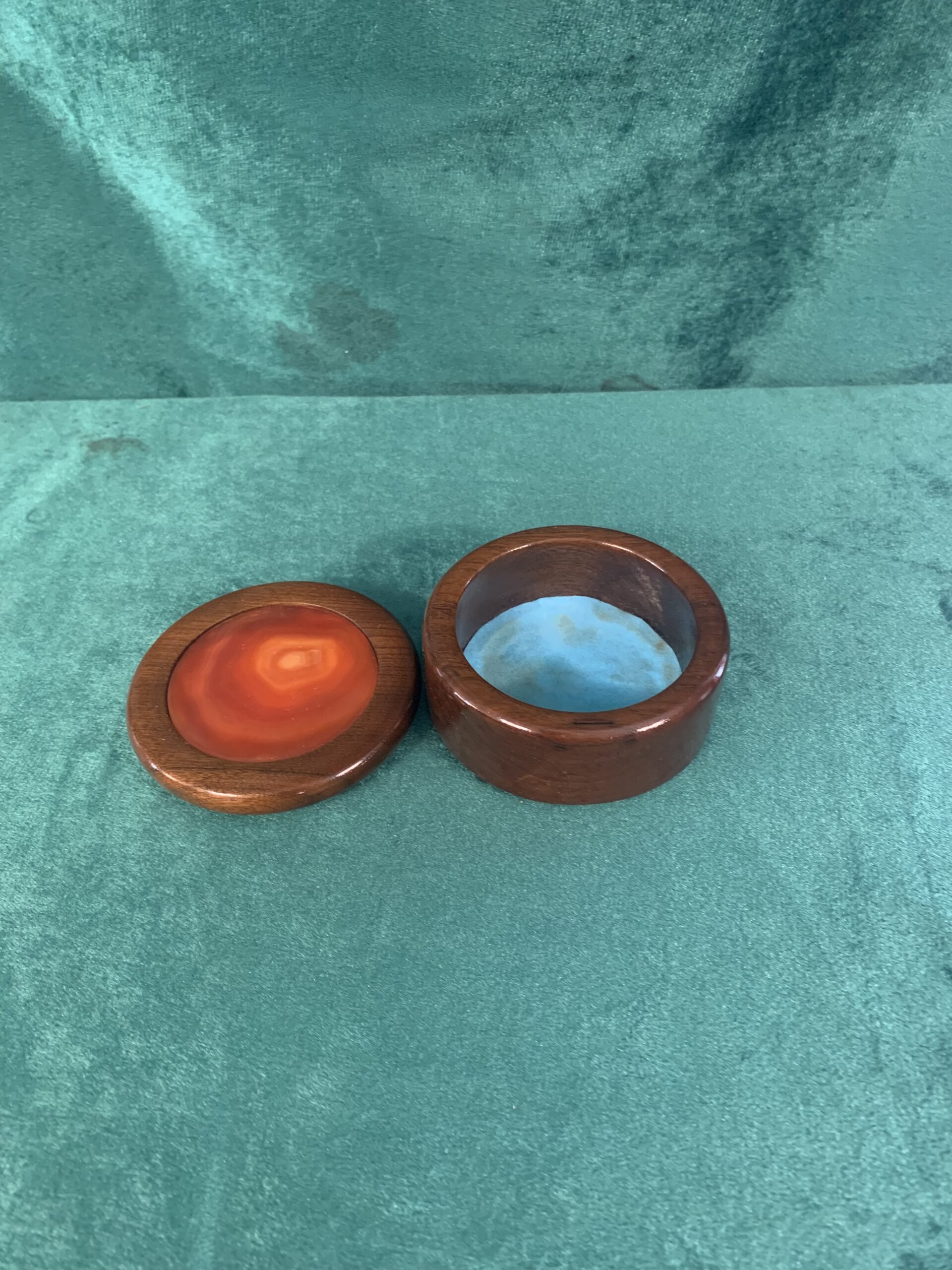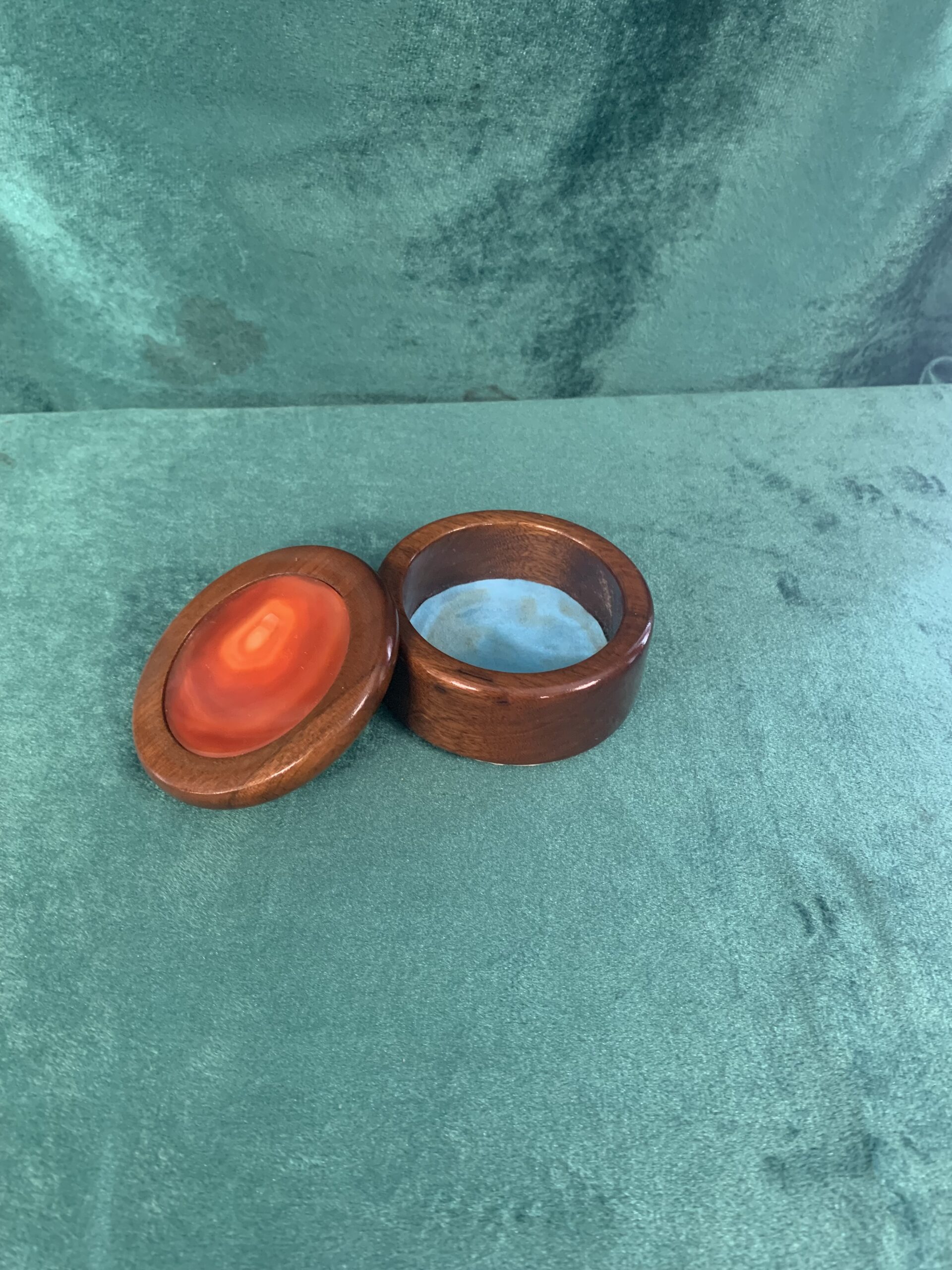 BONITA PAREJA DE ALHAJEROS EN MADERA, pareja de alhajeros de forma circular, a juego, en madera de cedro con un Ágata en cada una de ellos, una en color rojizo y la otra en azul verdoso procedentes del Líbano, estas bonitas cajas artesanales ideales como joyeros, posiblemente de los años 70, perteneciente a la colección de un procurador de Justicia.