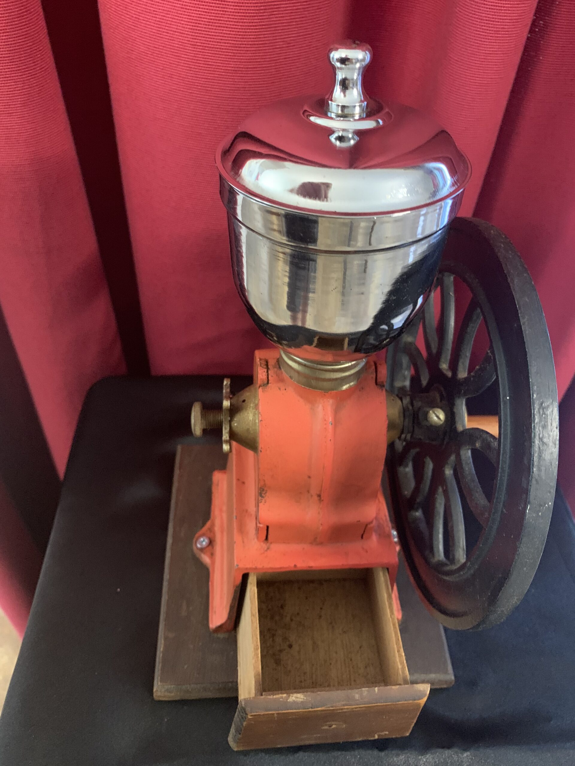 ANTIGUO MOLINILLO MANUAL DE CAFÉ AÑOS 30, molinillo de café manual de volante, en hierro fundido aluminio y madera fabricado en los inicios del S.XX, posiblemente de la marca española ELMA.