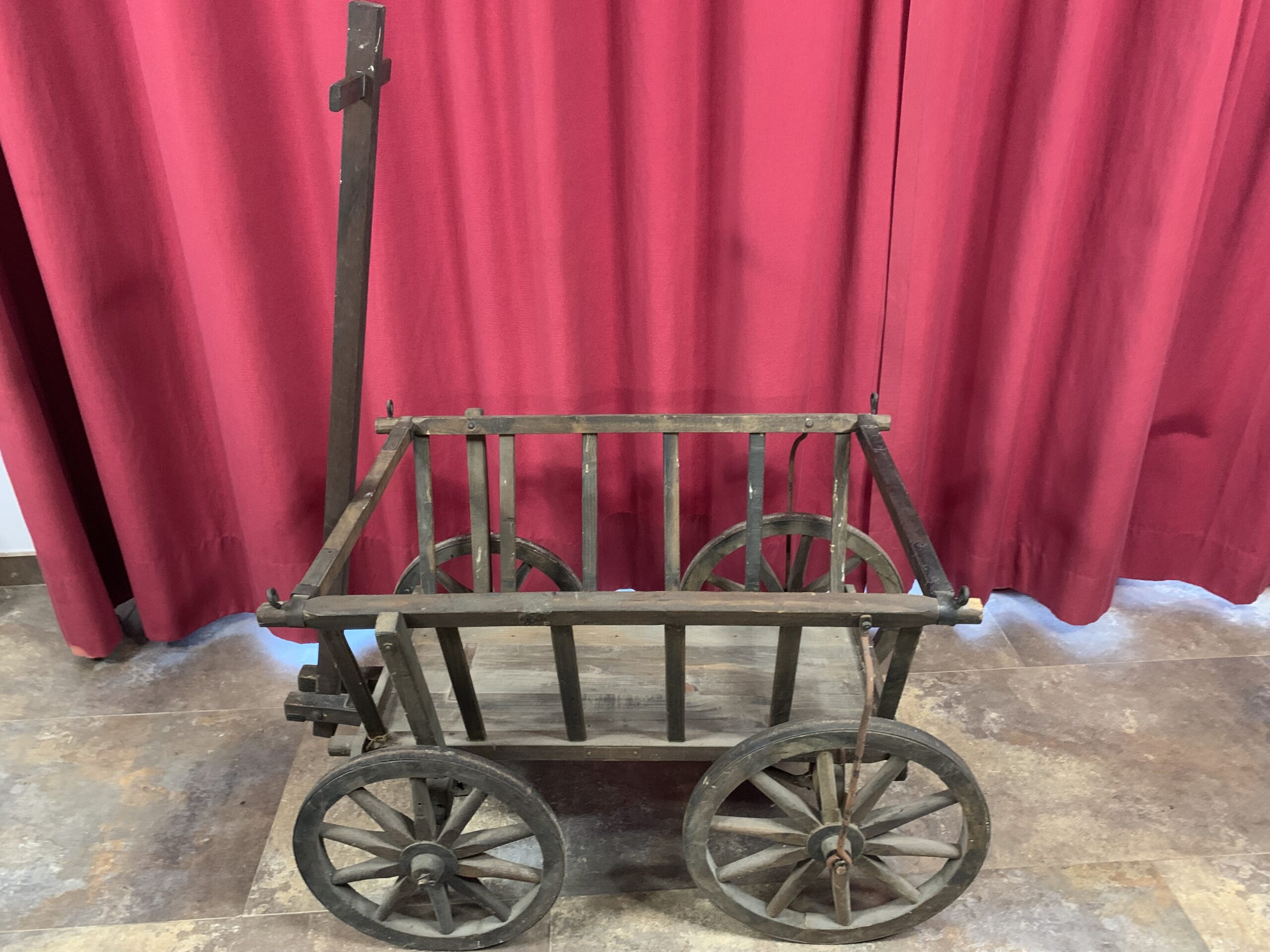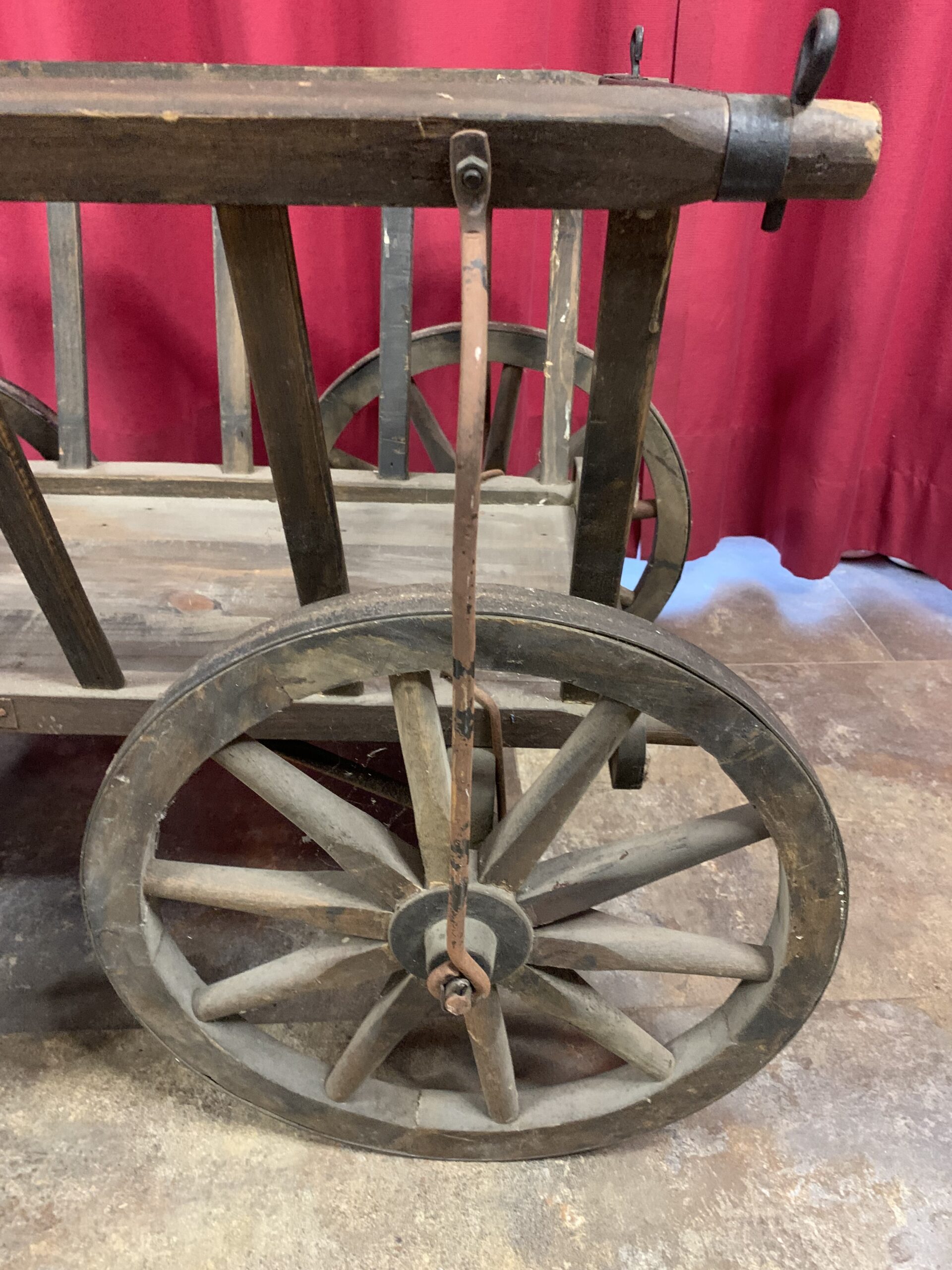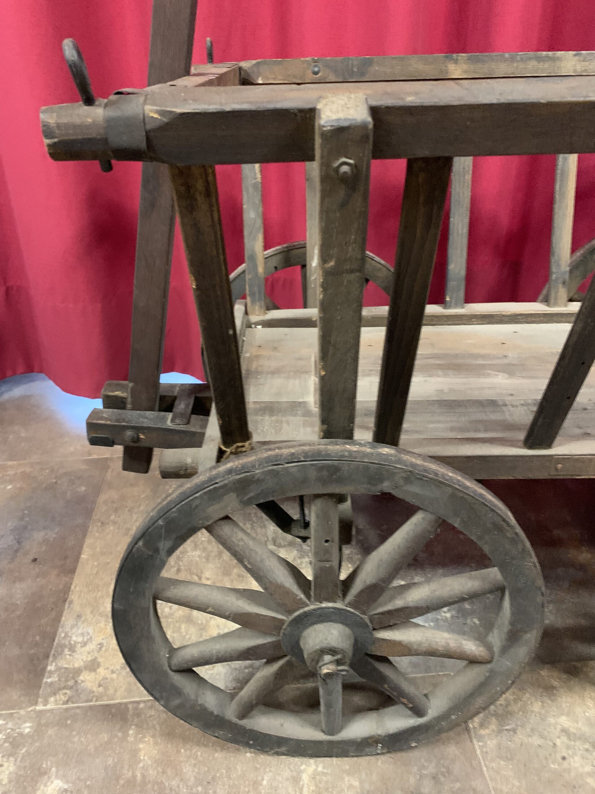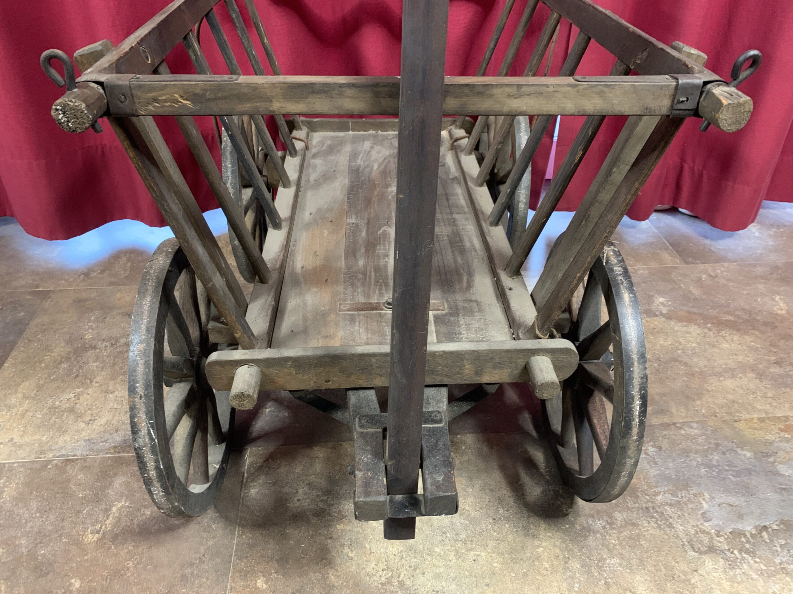 ANTIGUO CARRO DE MADERA ALEMAN SIGLO XIX, este antiguo carro patatero alemán posiblemente de la década de 1890, fabricado en madera de roble, posiblemente barnizado a lo largo de los años con la pátina acorde a su antigüedad, de estilo Provenzal Francés, se desconoce si ha sido tratado para exteriores, leve oxido en remaches y en alguna de las zonas de hierro