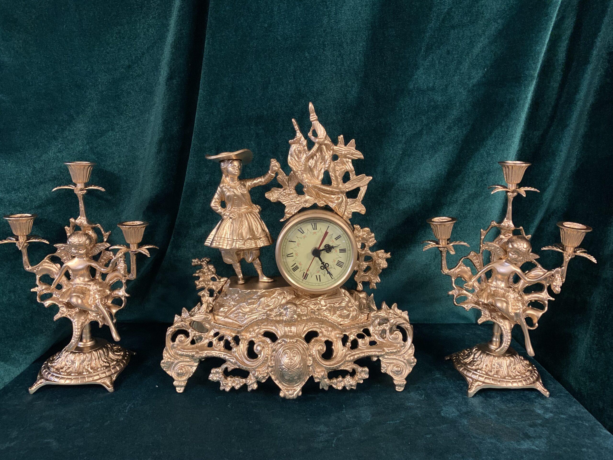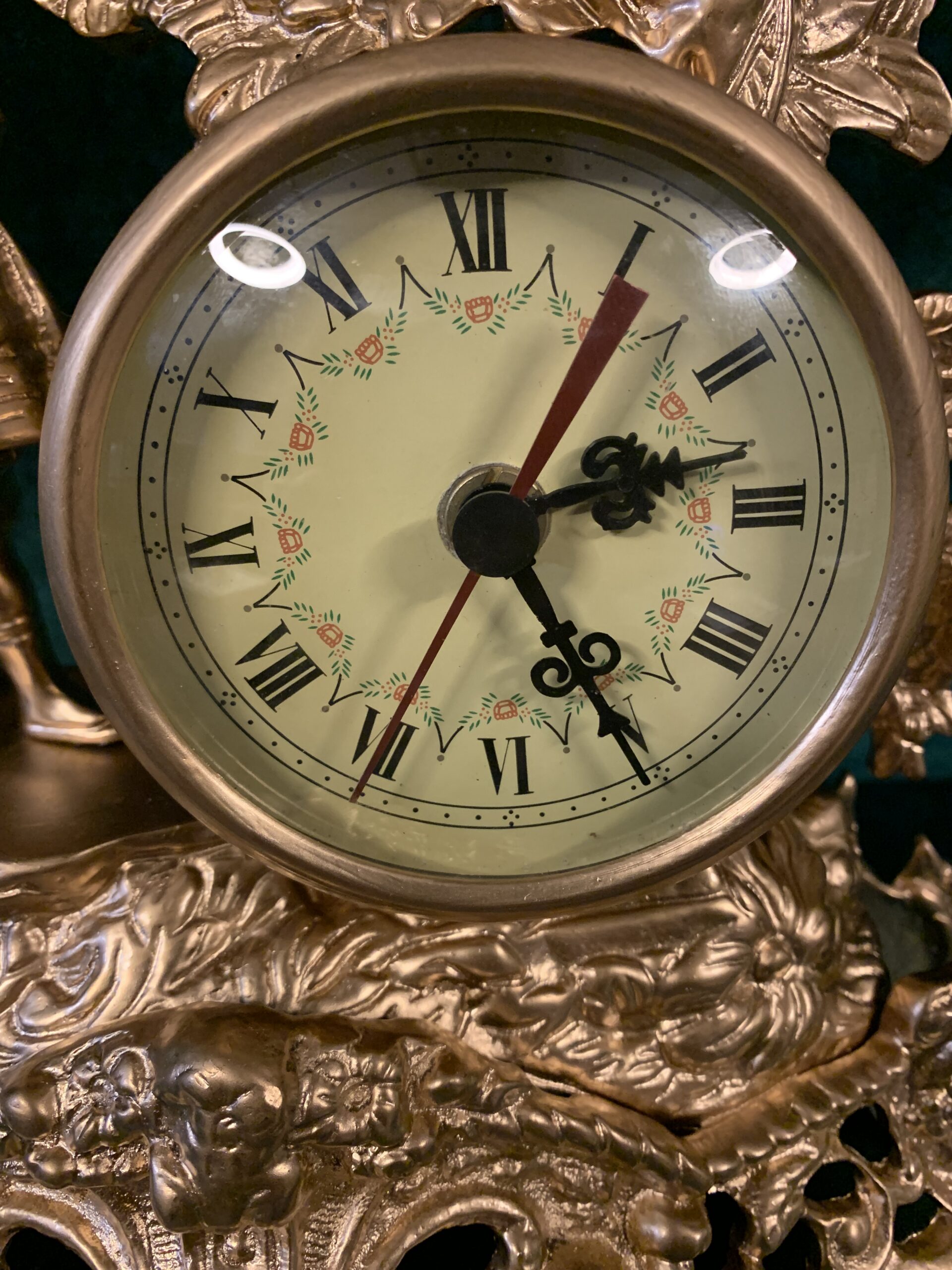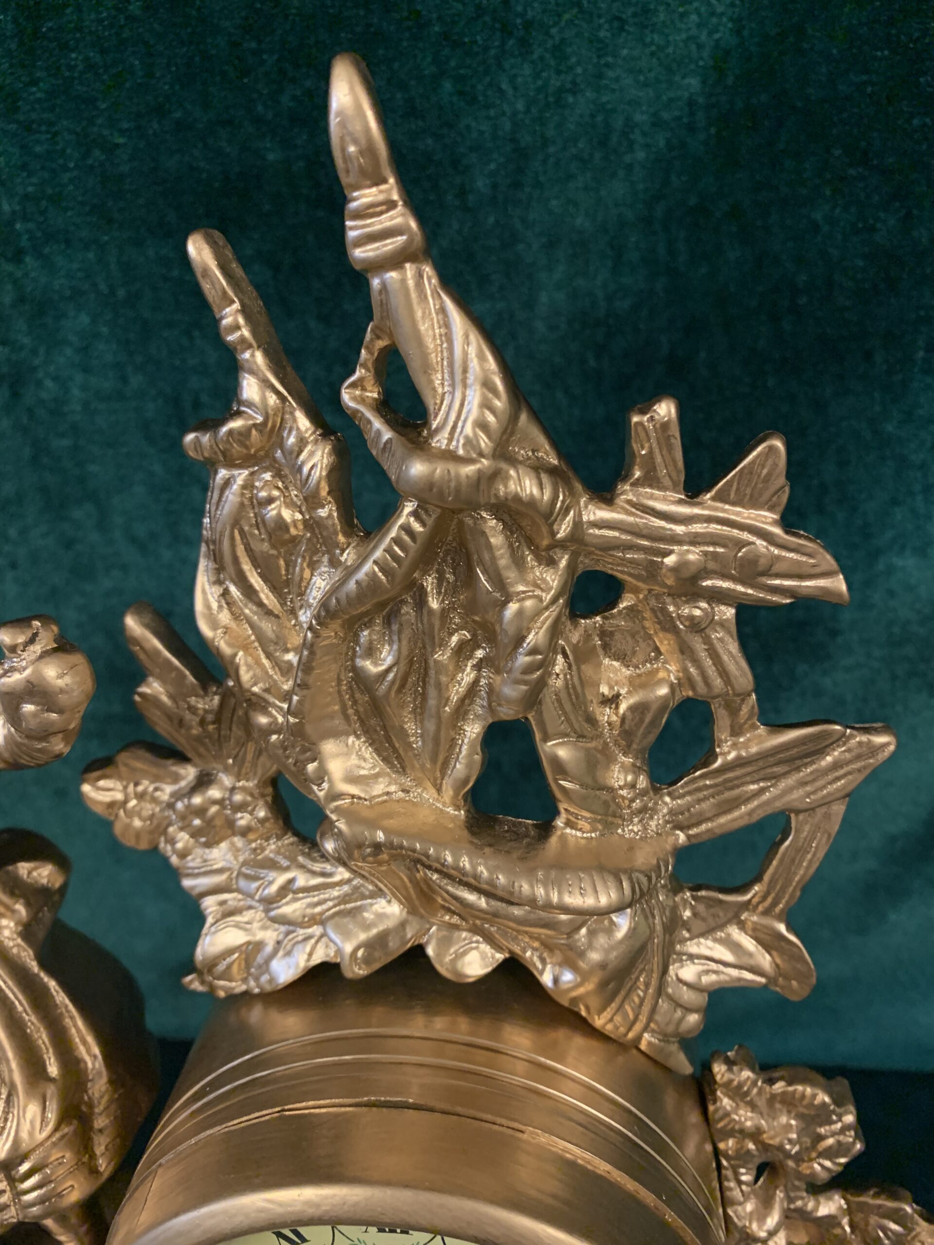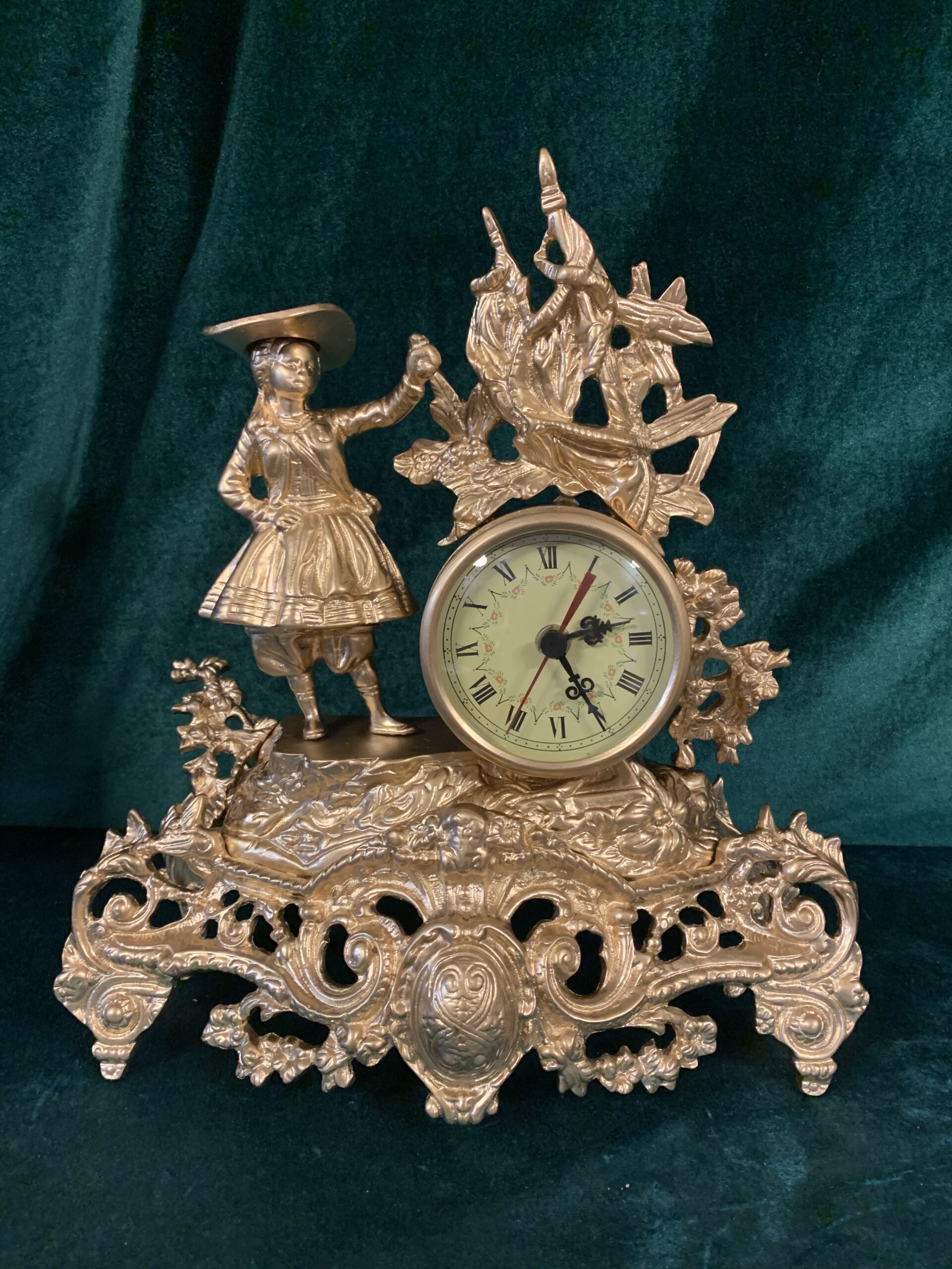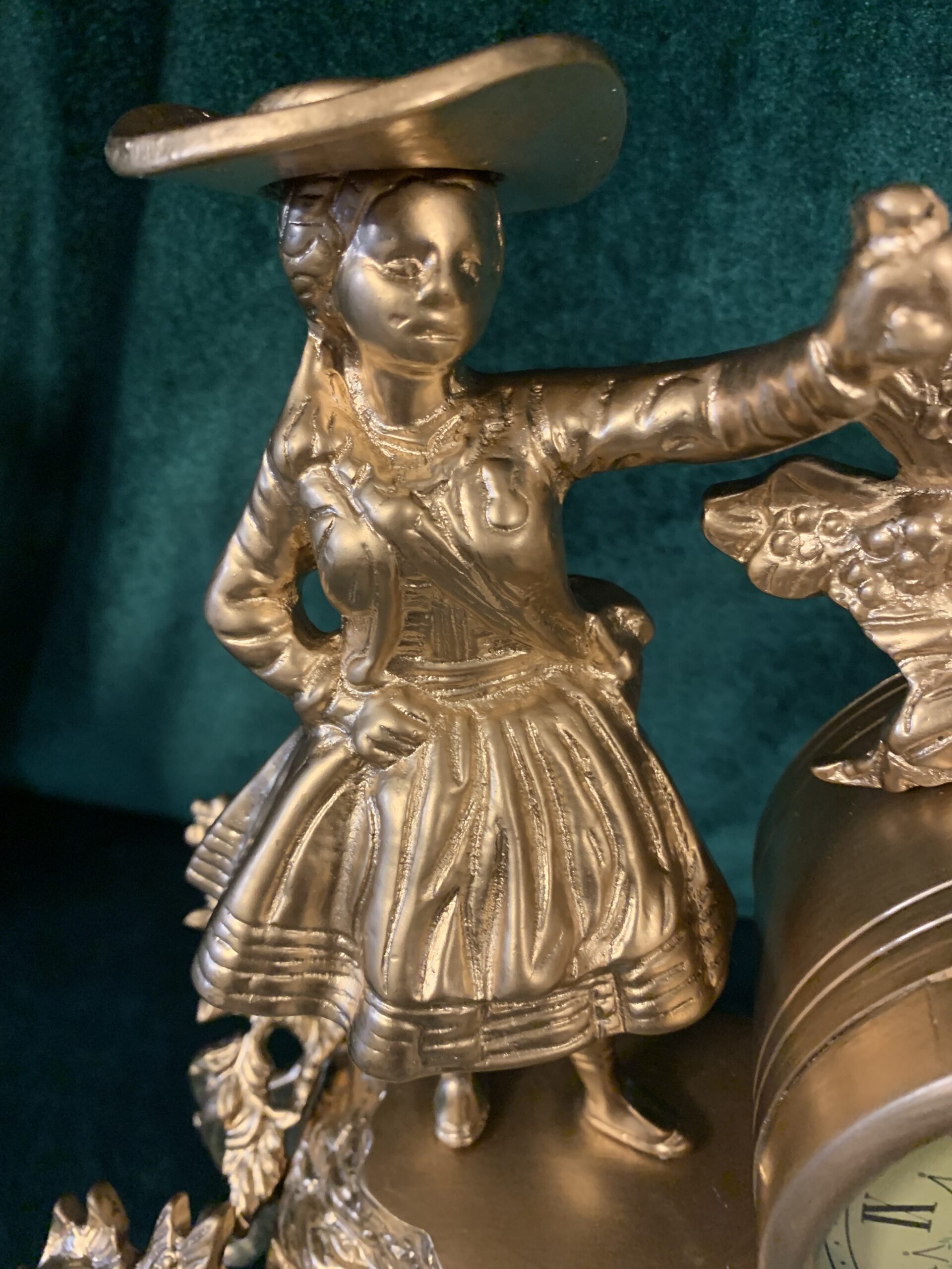 Maravilloso reloj fabricado en bronce por artesanos portugueses años 30/40 del siglo XX, con decoración antropomorfa de una campesina al lado de una valla, decorados a mano en pintura de oro con magníficos detalles en relieve que la convierten en una magnifica la pieza, su reloj funciona correctamente con un mecanismo rehabilitado posiblemente en los años 80/90, esta pieza hace juego con el par de candelabros con referencia 0309001, tal como se puede observar en las fotografías.