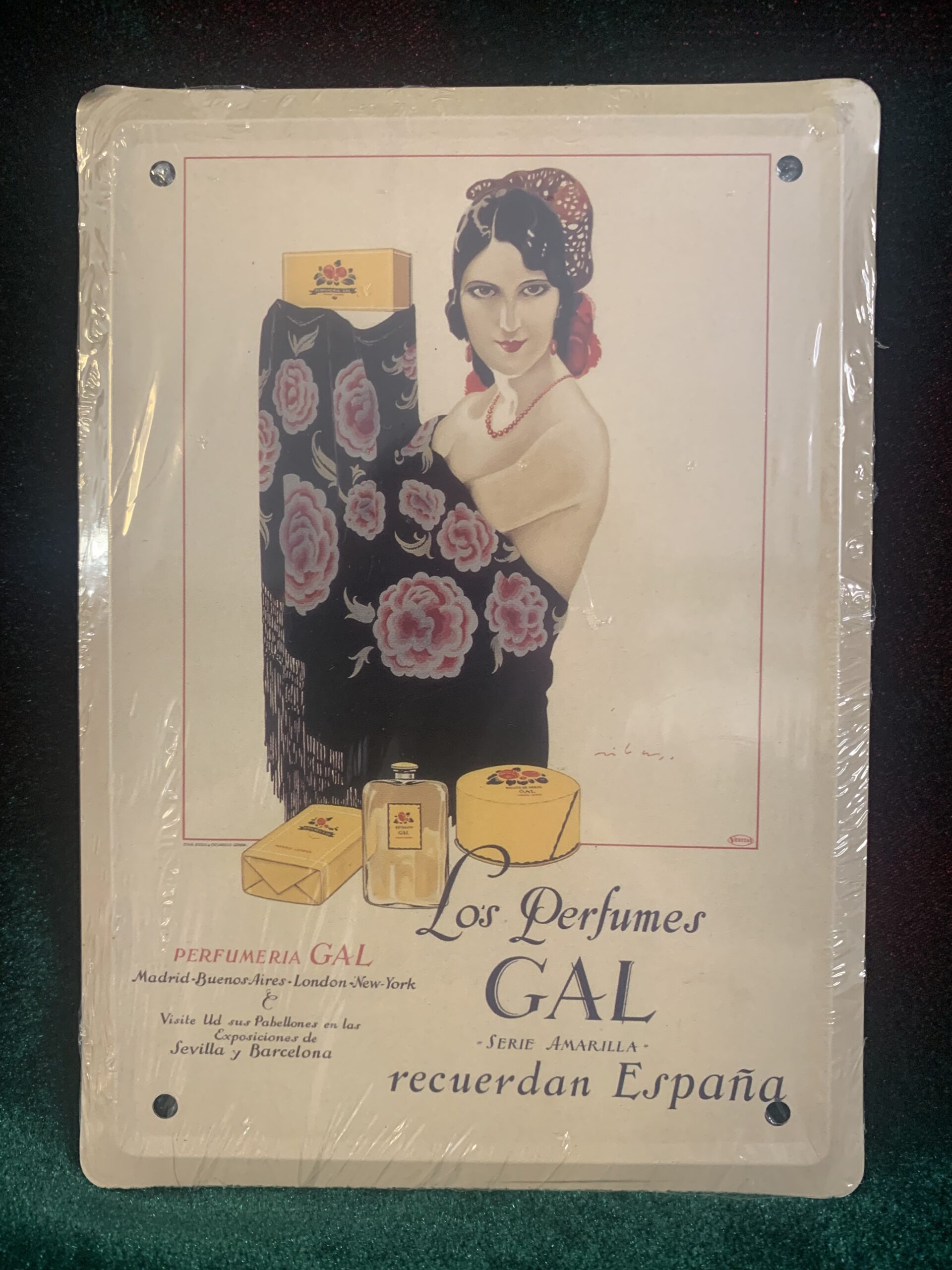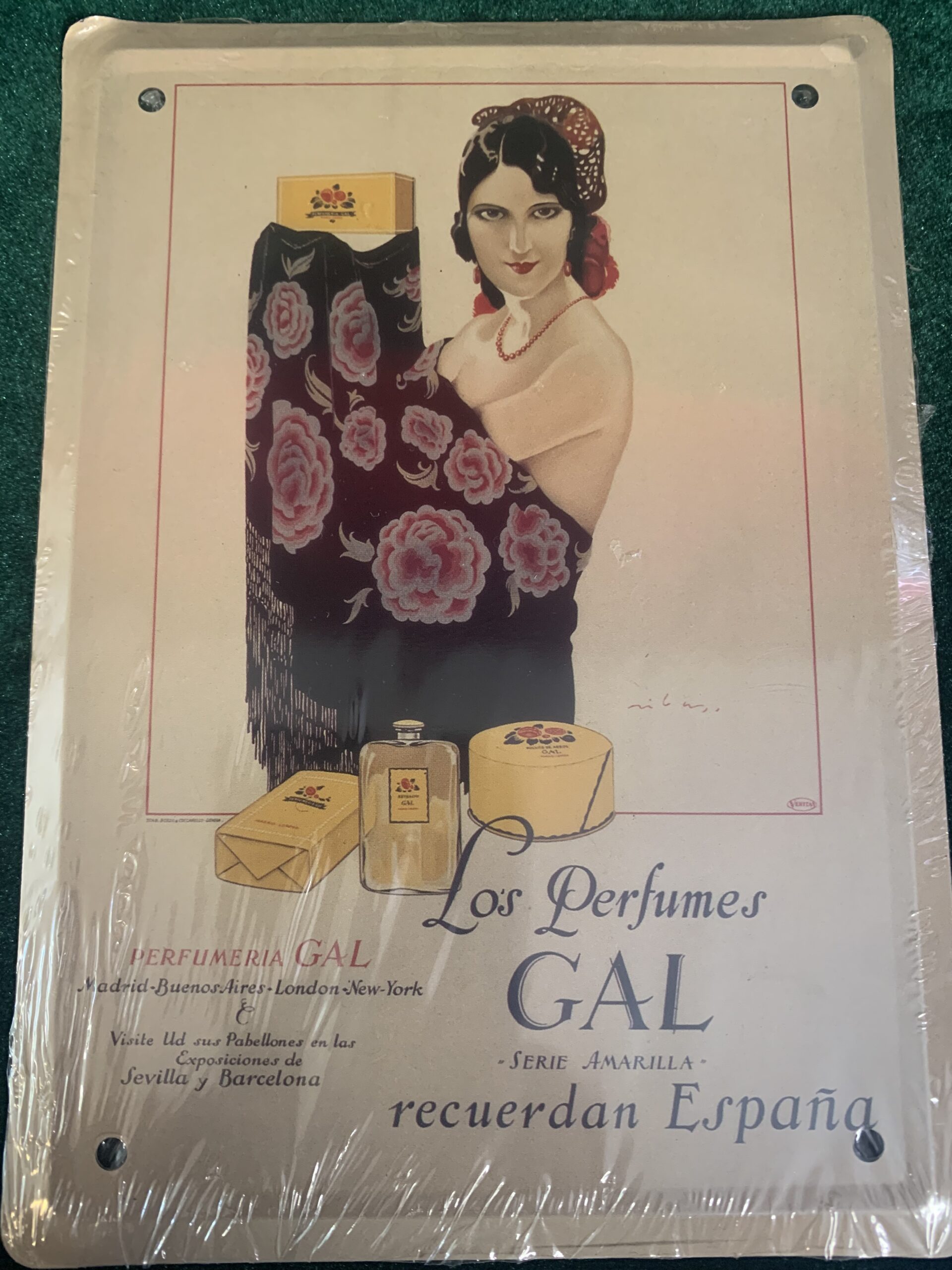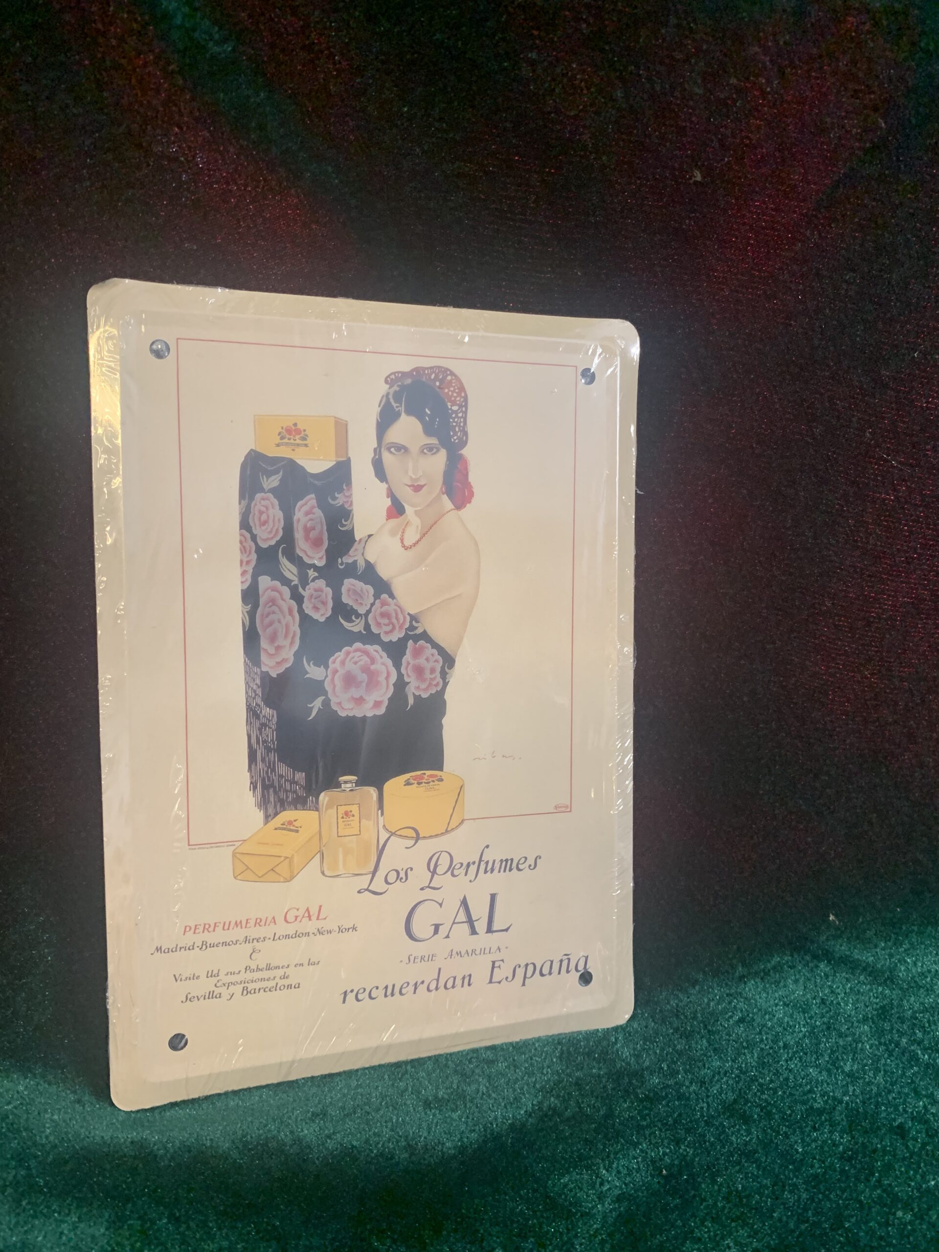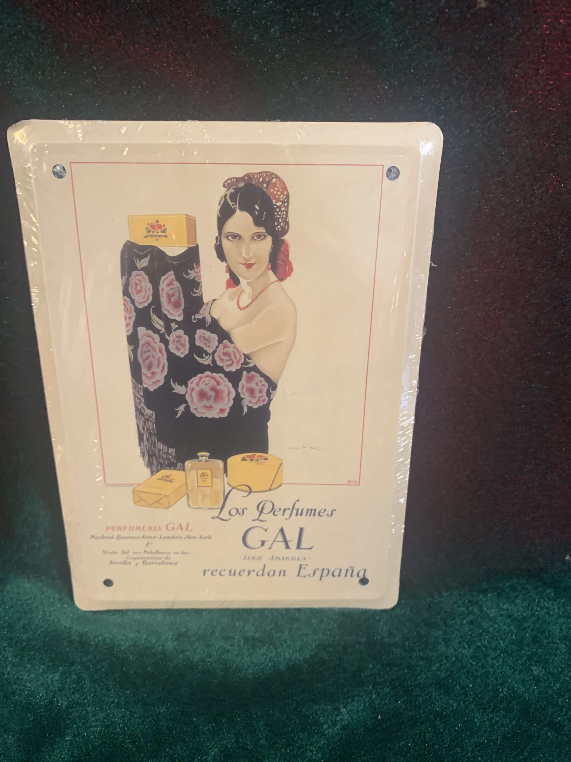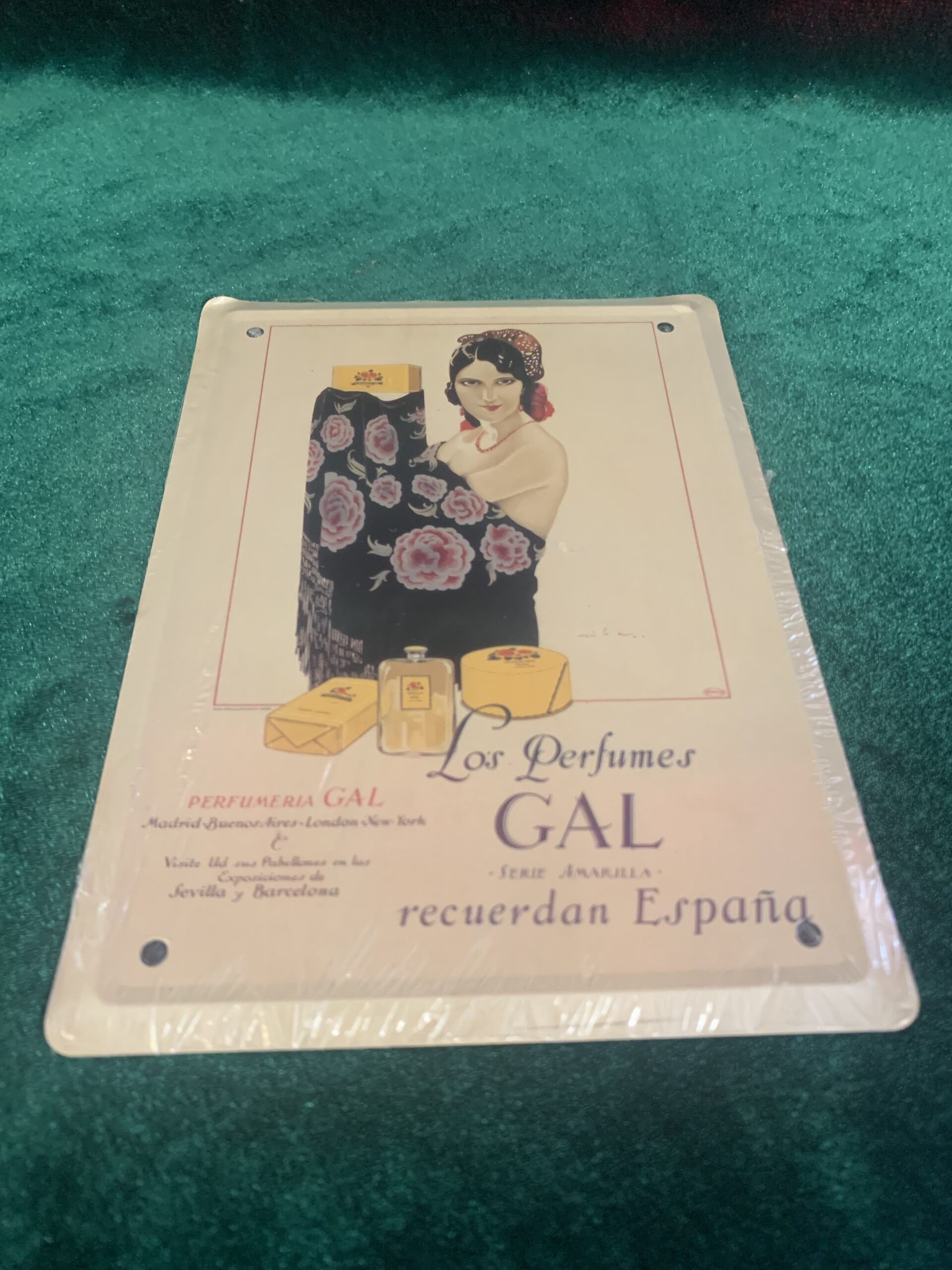 CARTEL PUBLICITARIO METÁLICA PERFUMES GAL, representación del cartel publicitario de la empresa . del año 1925, fabricado en chapa metálica litografiada de la colección «Los anuncios de tu vida, 1900-1960»,
