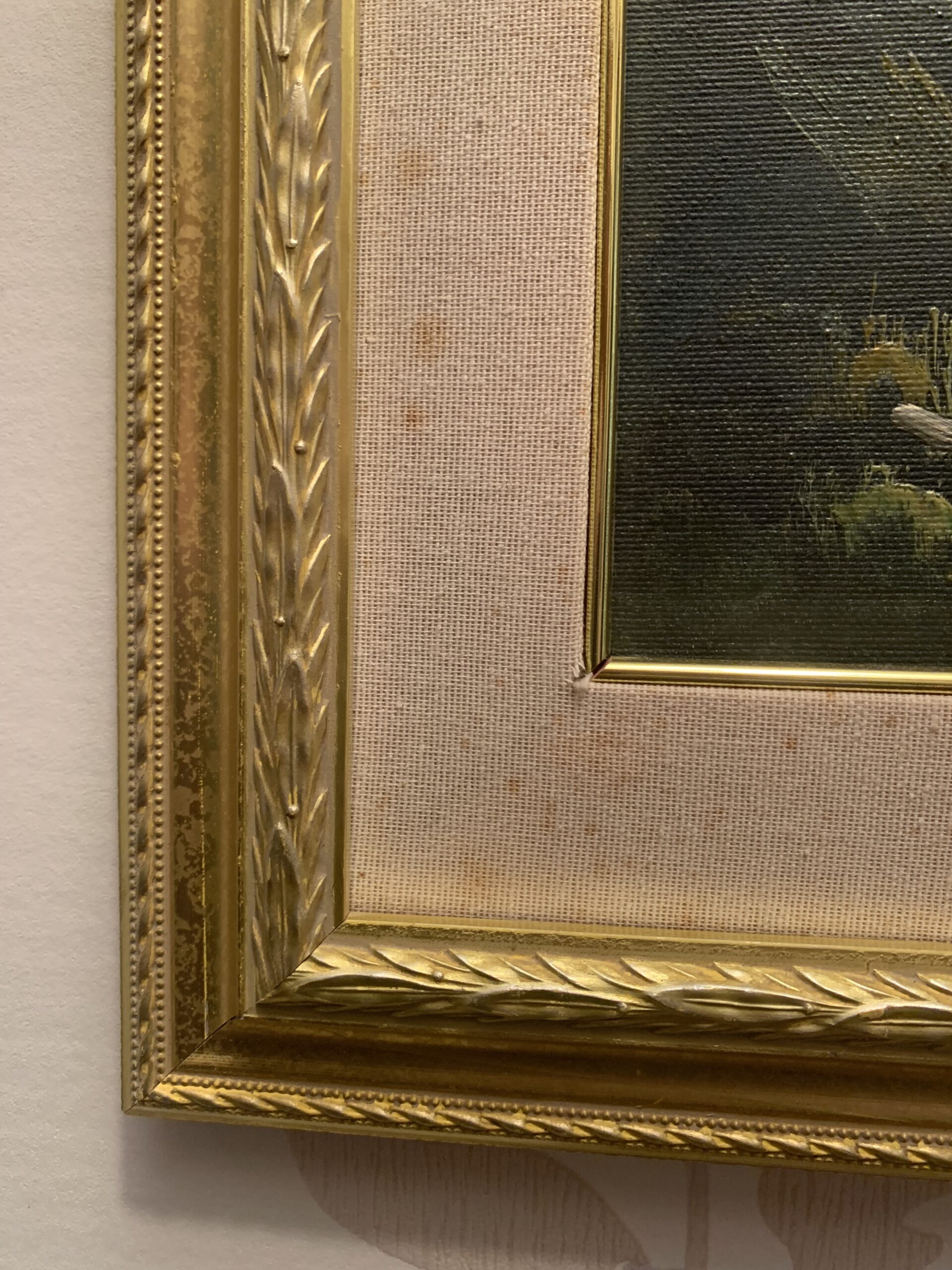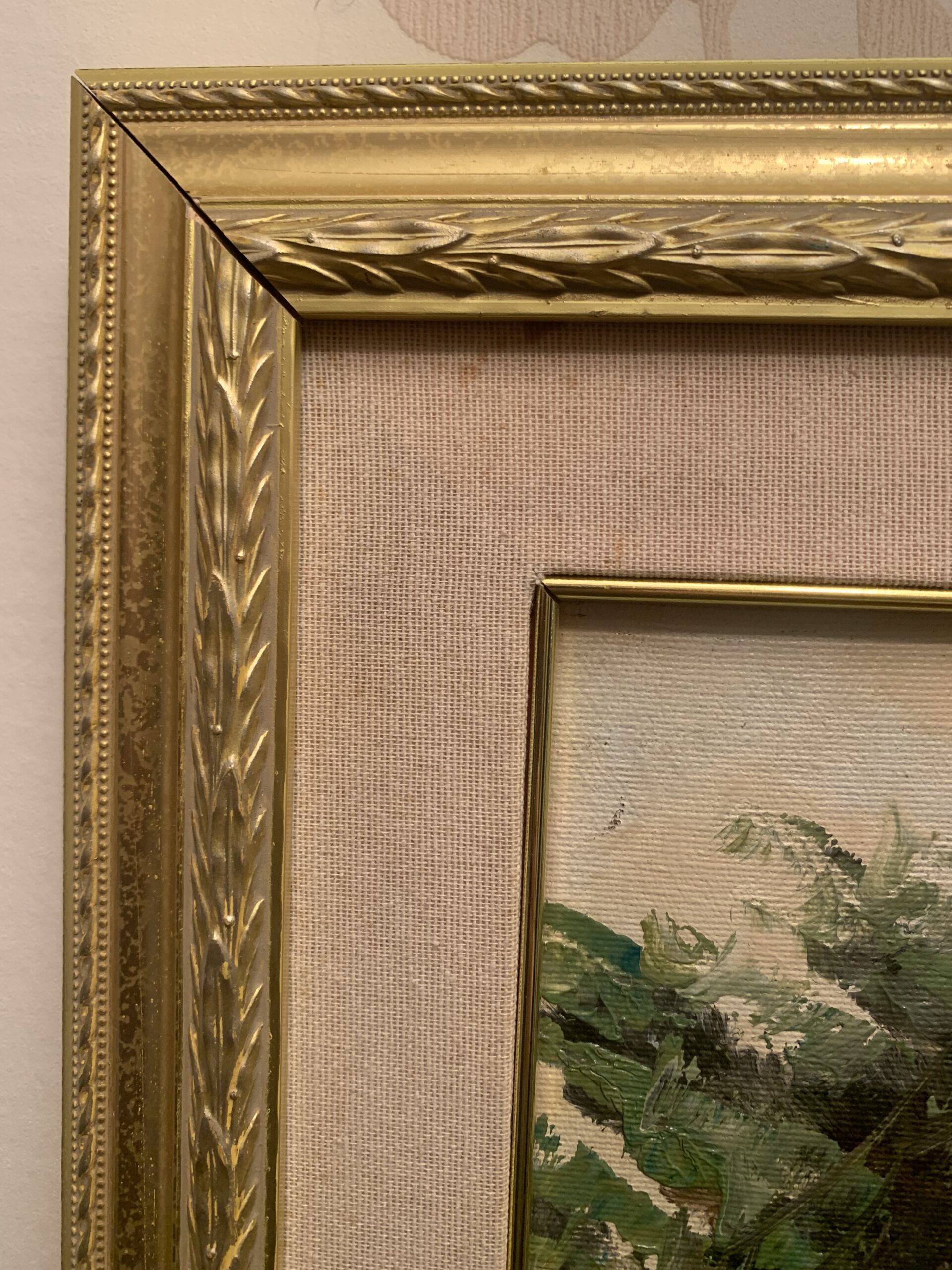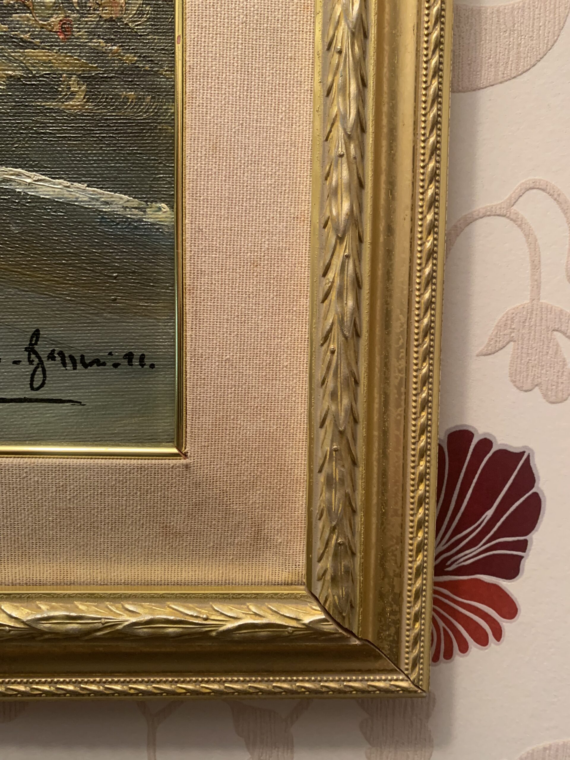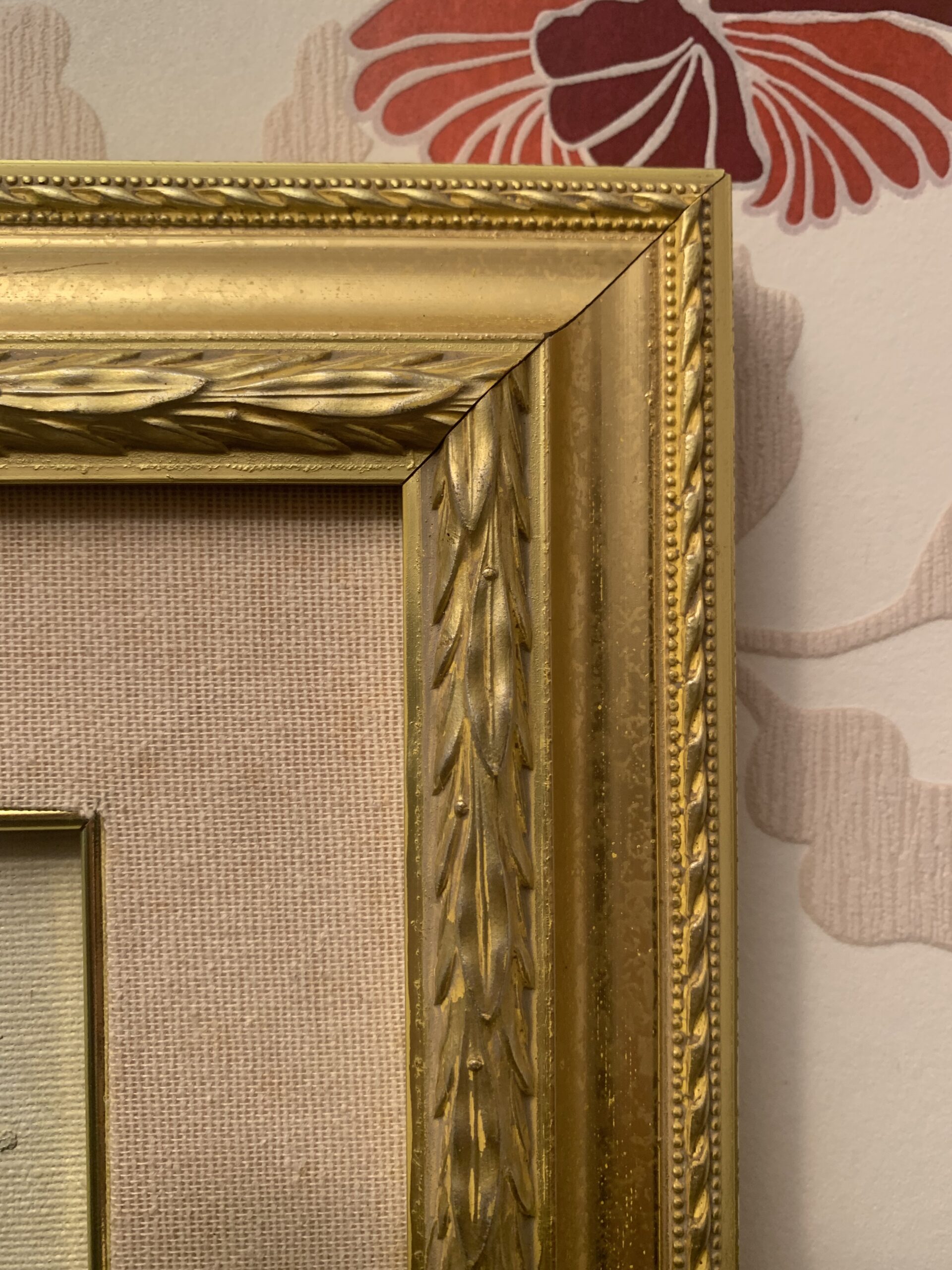 Expuesto en un antiguo doble marco de madera de estilo alfonsino, con una decoración de festones de laurel y marco interior forrado en tela.