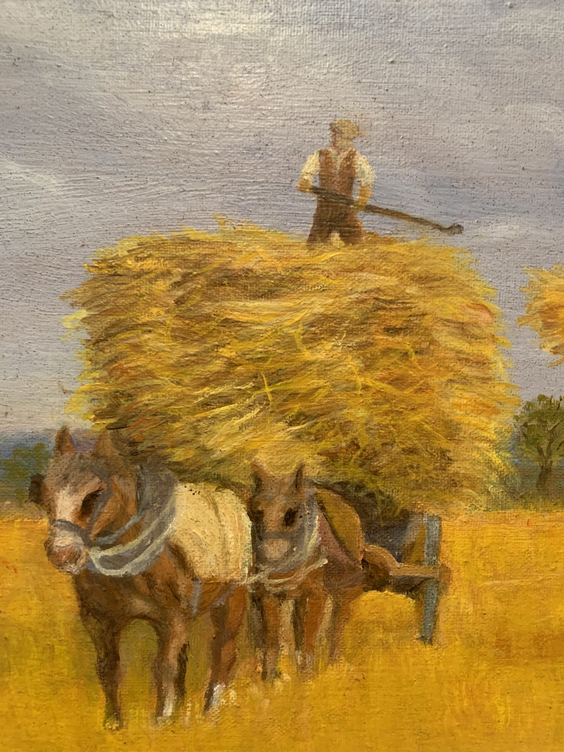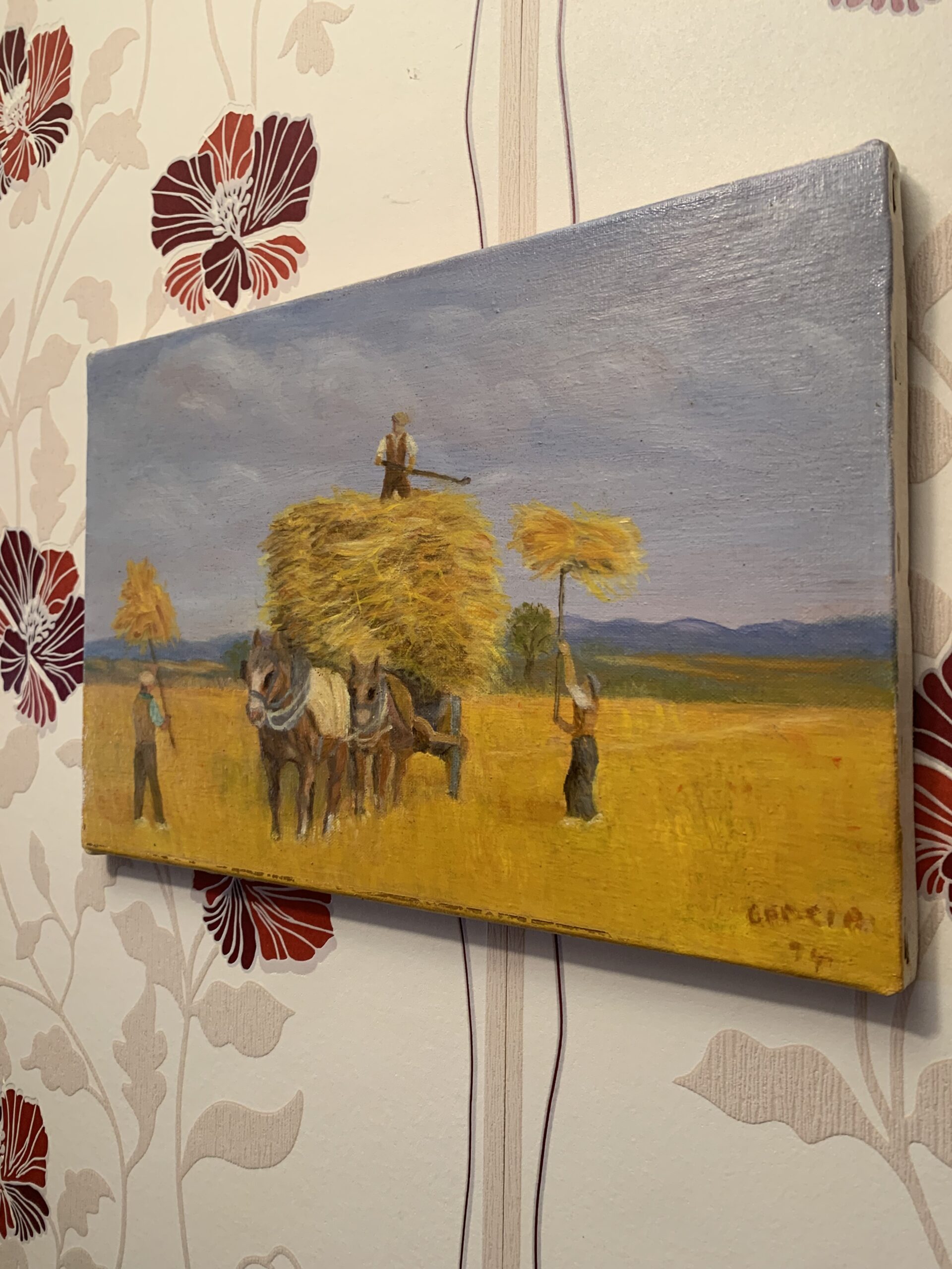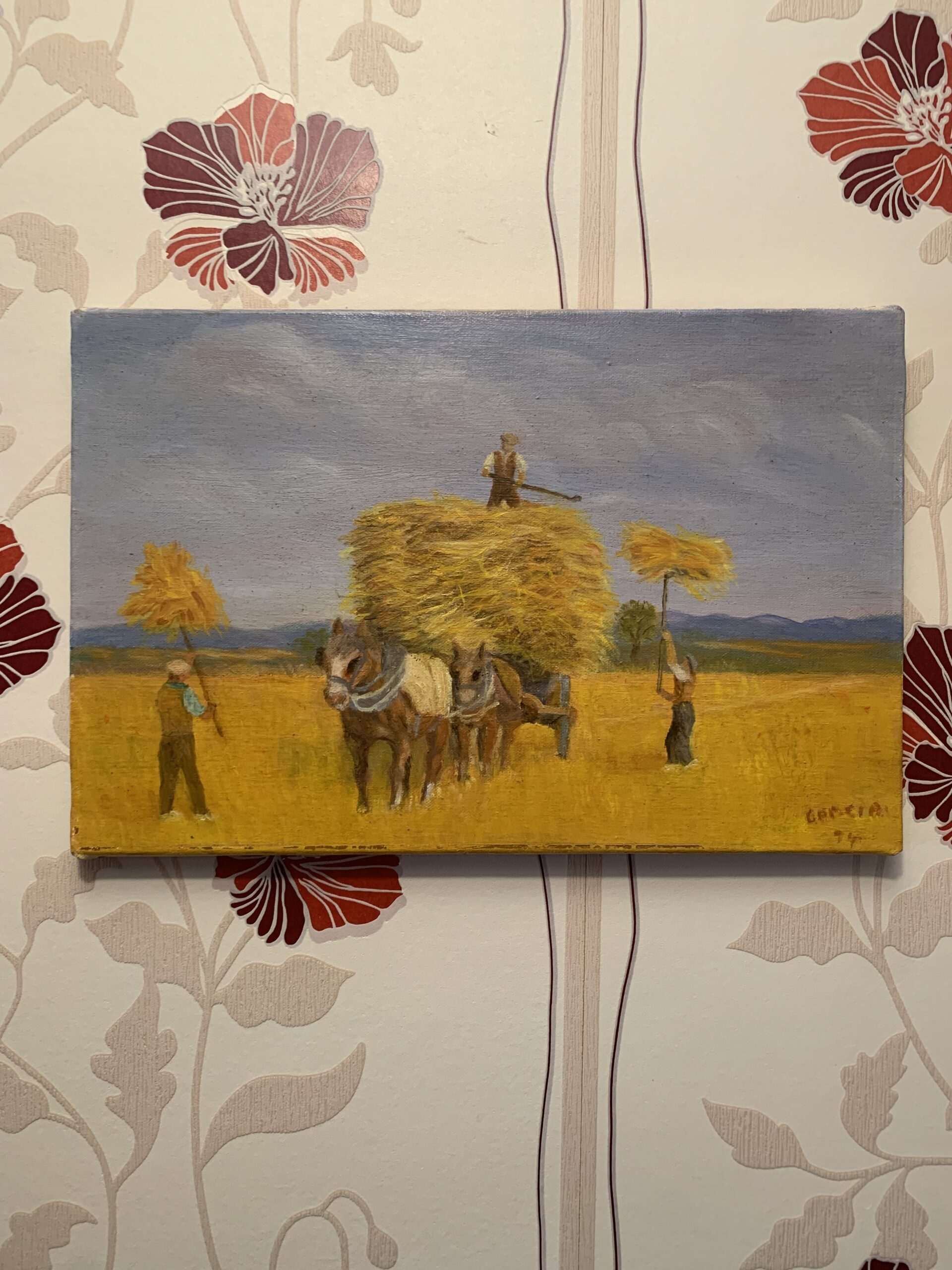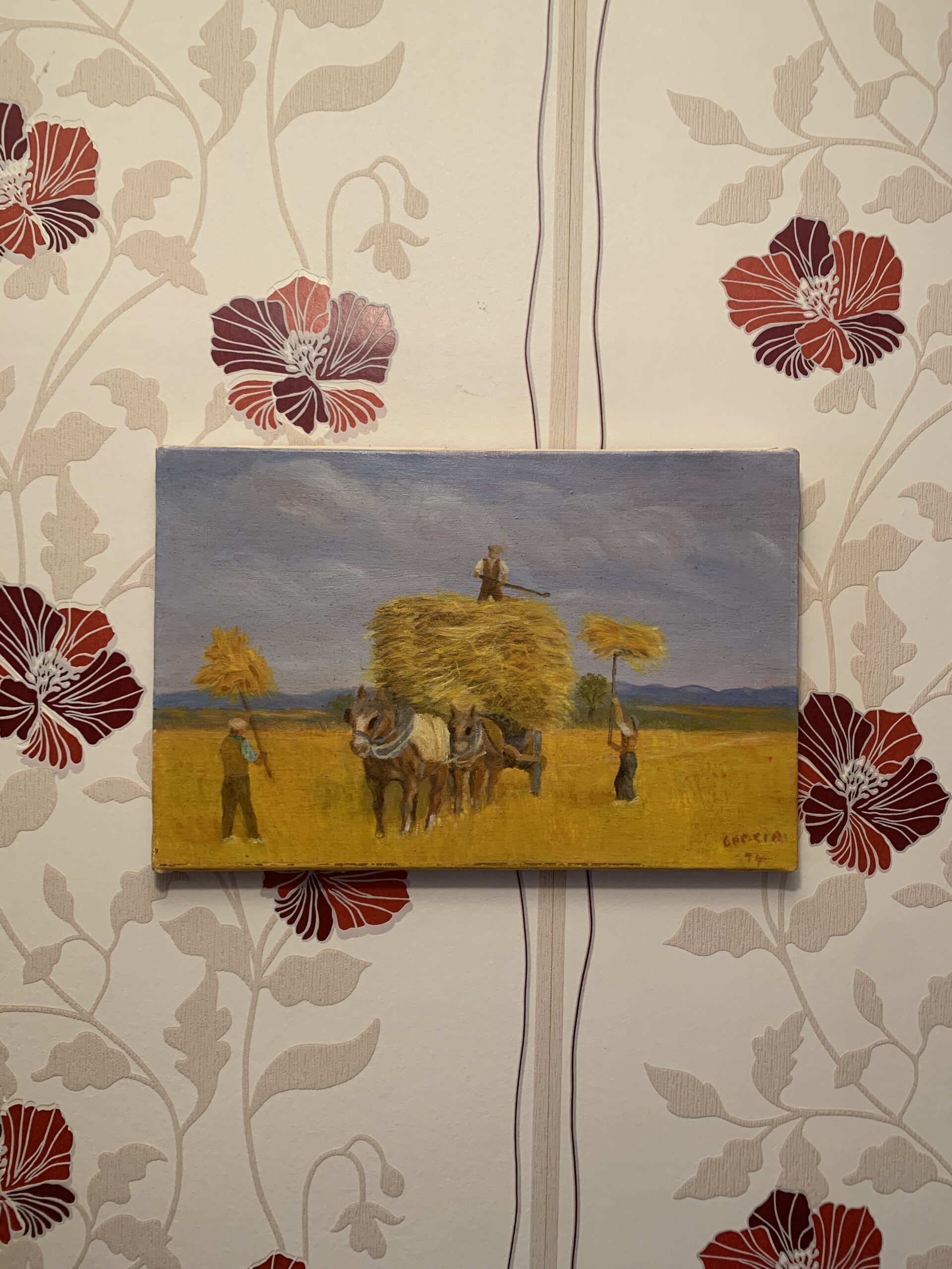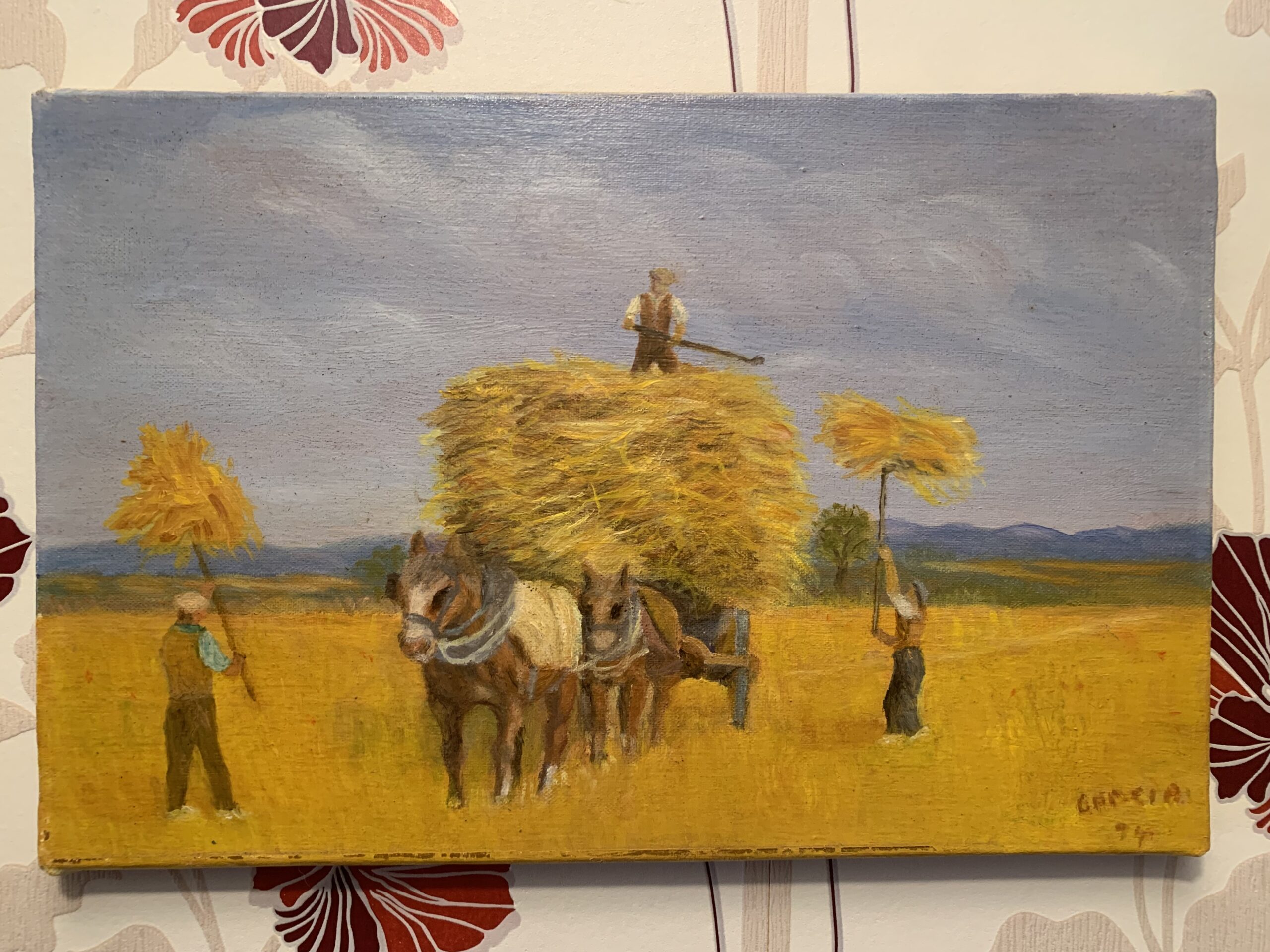CUADRO AL OLEO SOBRE LIENZO AÑO 93, representando una escena bucólica del campo el la recogida del trigo, obra firmada por García. Realizado con gran detalle en trazos cortos y firmes.