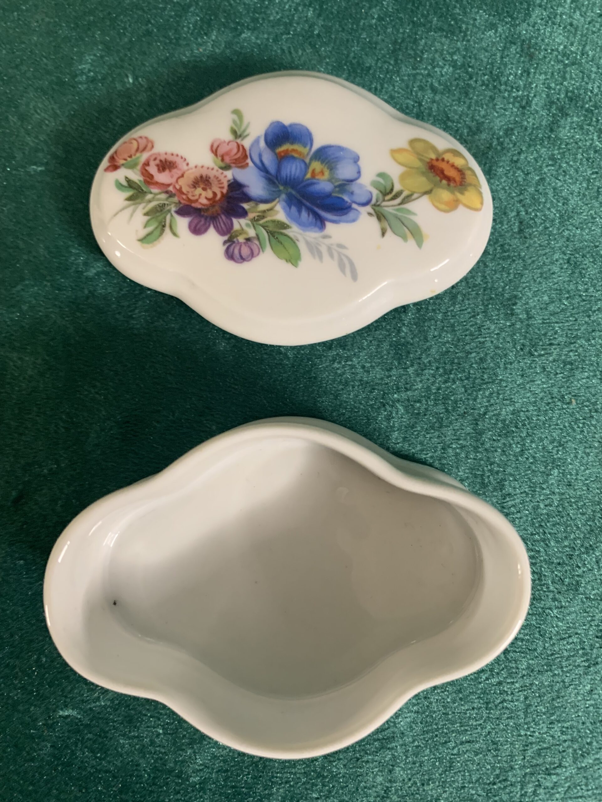 ONITOS ALHAJEROS PASTILLEROS, alhajeros de porcelana de origen español, de la conocida marca Guillen, pintada a mano en policromía, representando motivos florales en forma ovalada y en forma de riñón de mediados del siglo XX