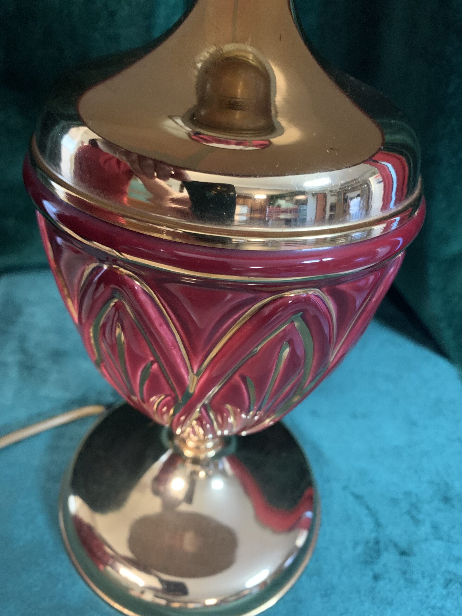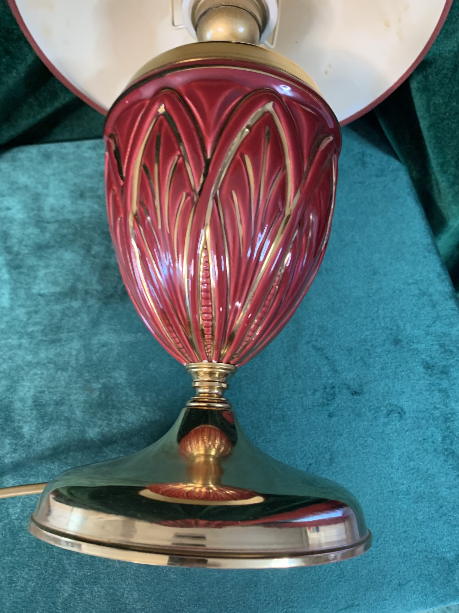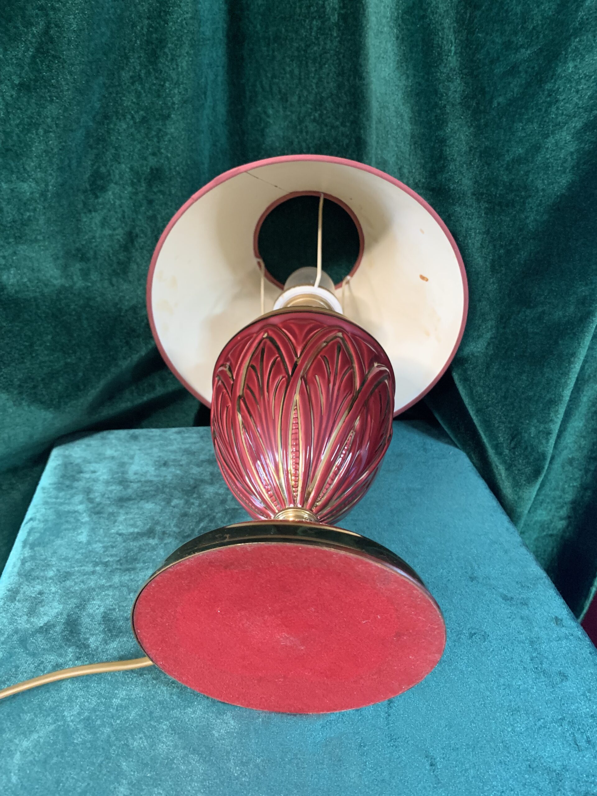 PRECIOSA LAMPARA DE MESA LATON Y PORCELANA, lámpara de fabricación nacional, de estilo art deco, en latón/cobre decorado en dorado y porcelana tallada en color rojo/fucsia y pantalla en cono en color fucsia.