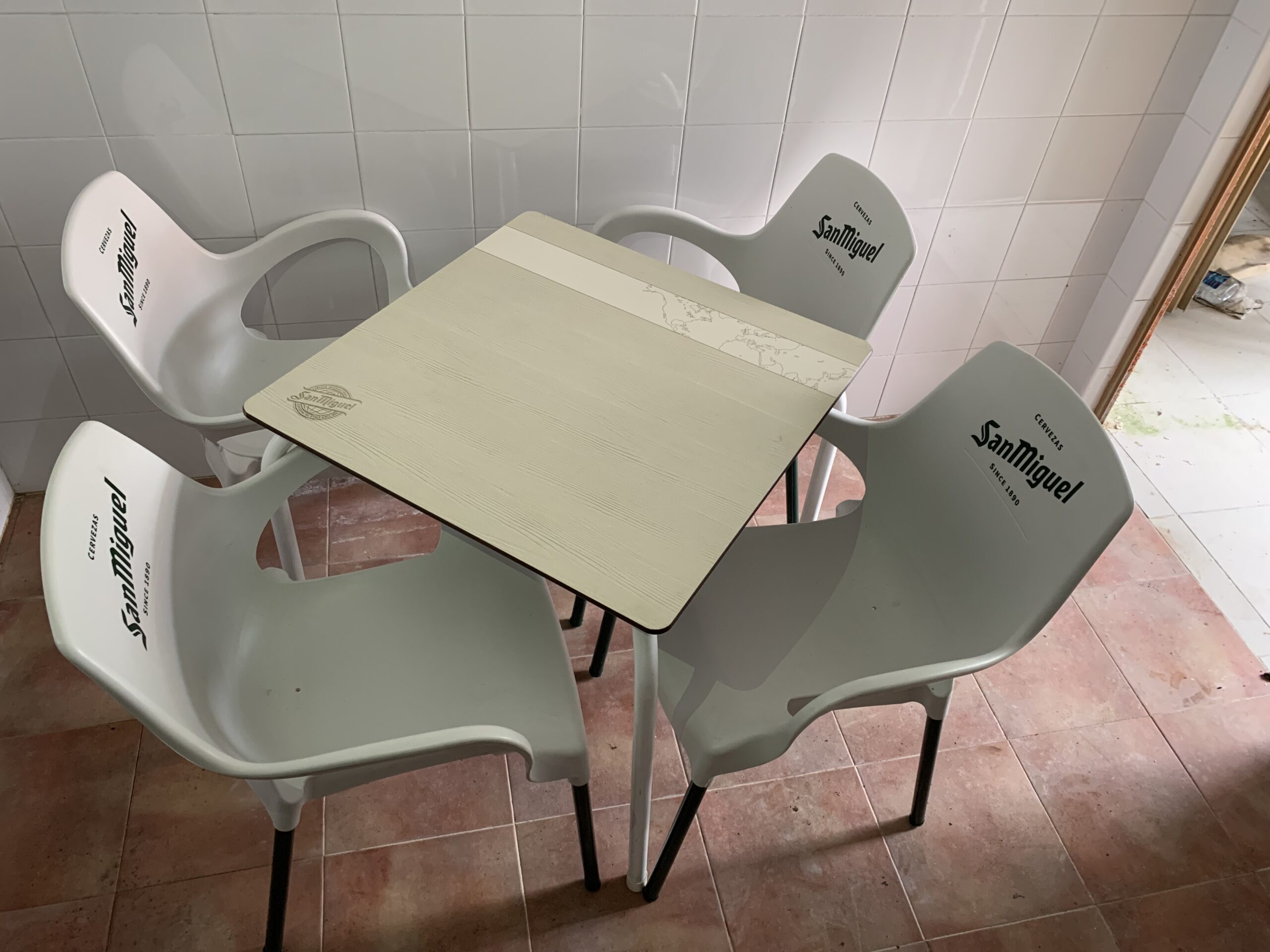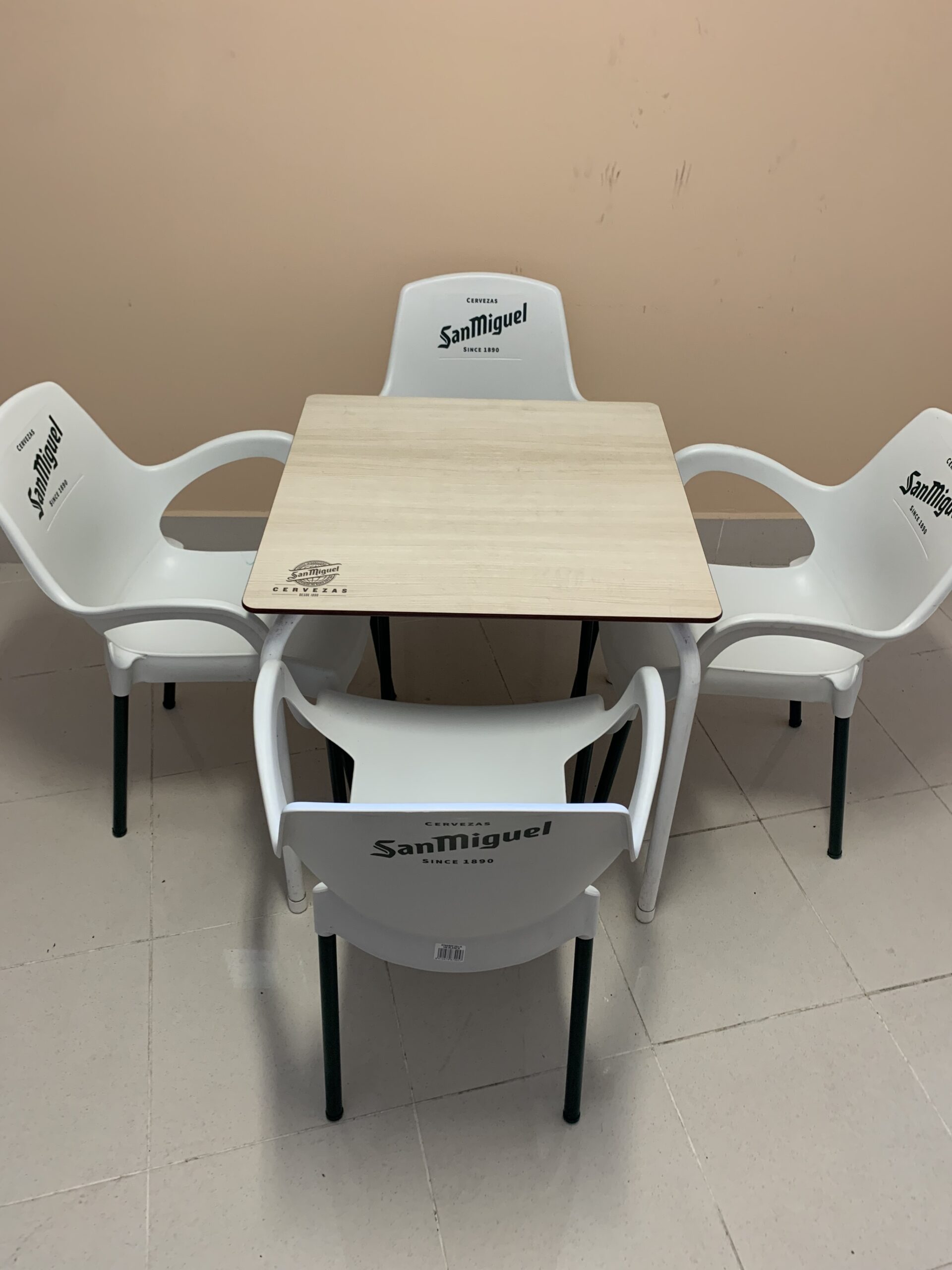 Conjunto de mesa y cuatro sillas publicitarias, en polietileno y aluminio ionizado, mesa con tablero Compac para terrazas y exteriores, de la cervecera San Miguel.