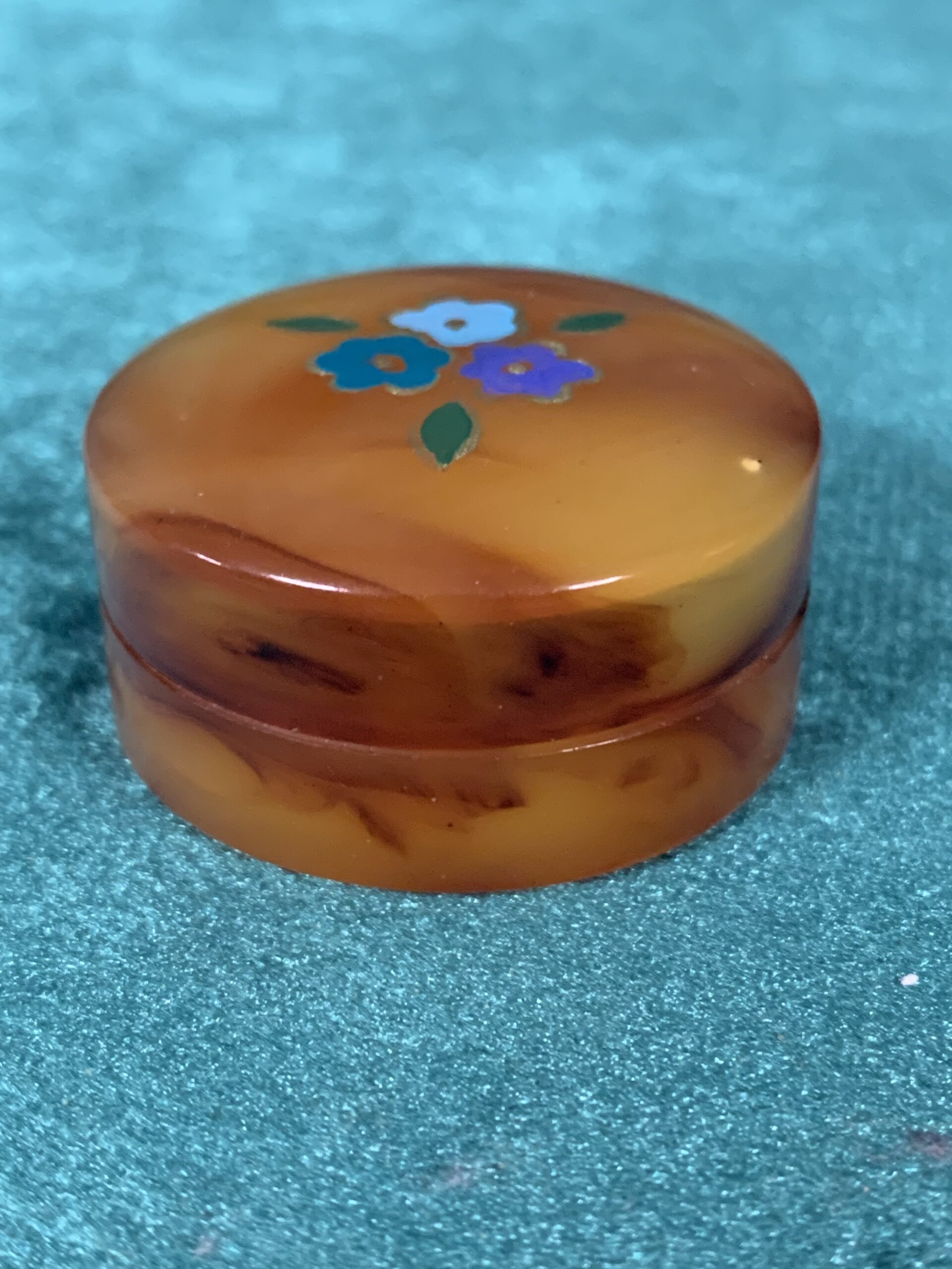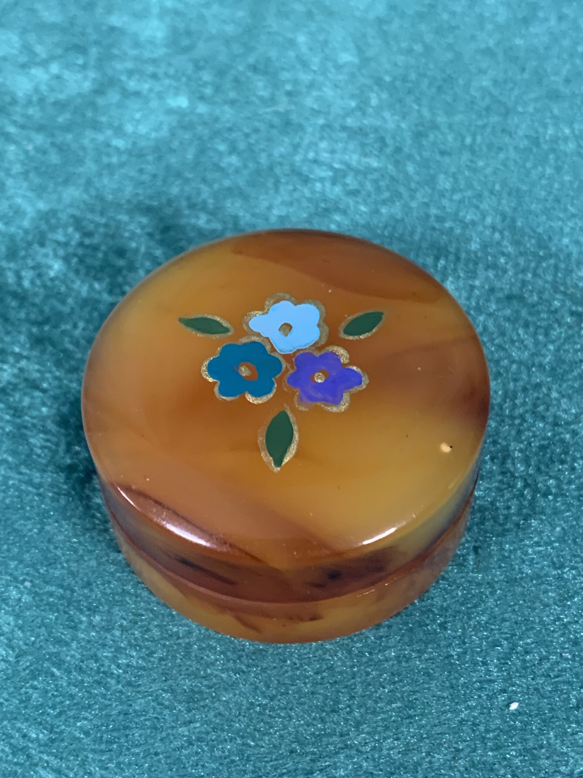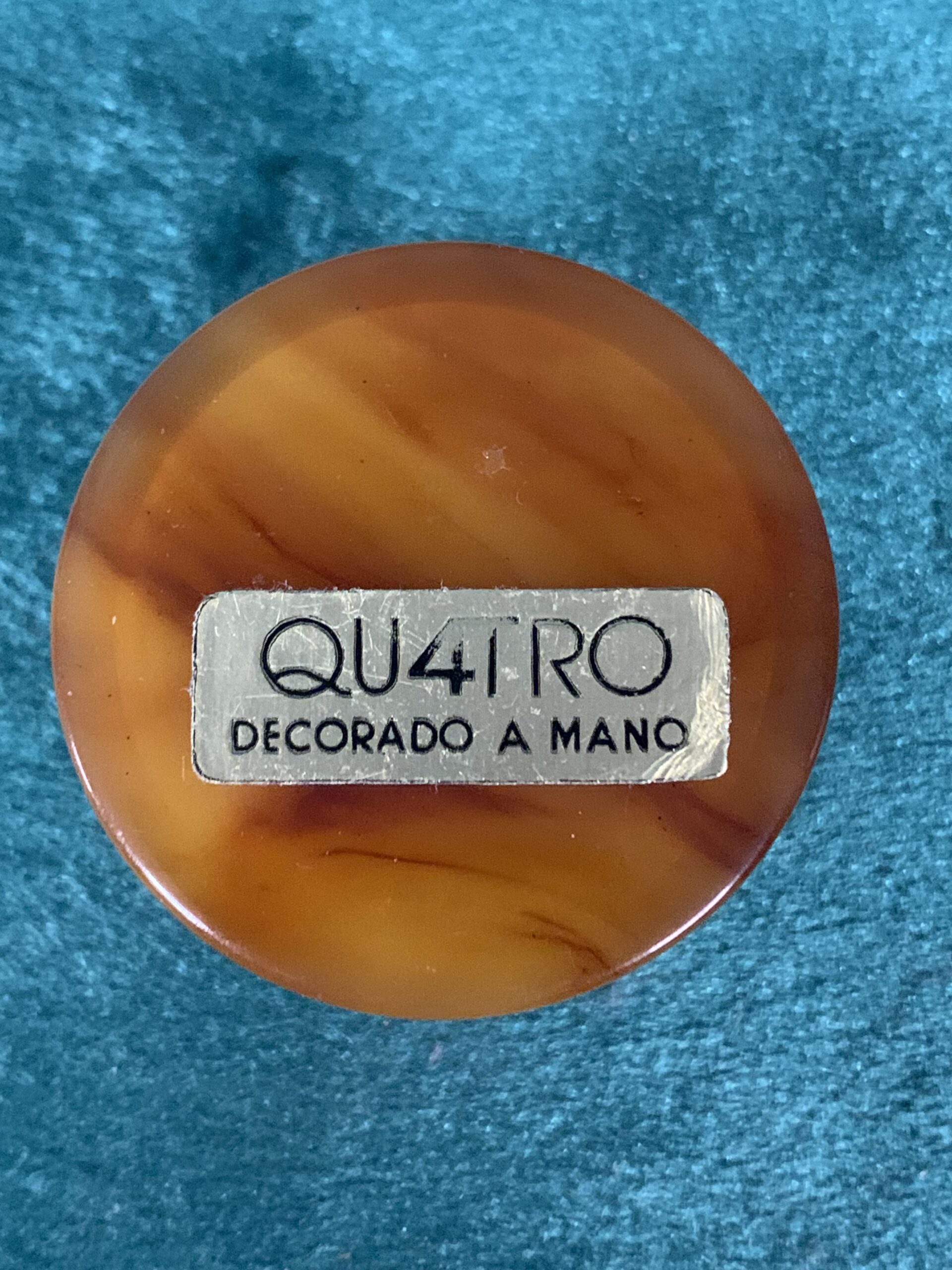 BONITO PASTILLERO, JOYERO, CAJA DE TOCADOR, de de la marca QU4TRO, fabricada en Carey, pintada a mano en marmoleados y decoración floral en su tapa superior posiblemente de los años 80.