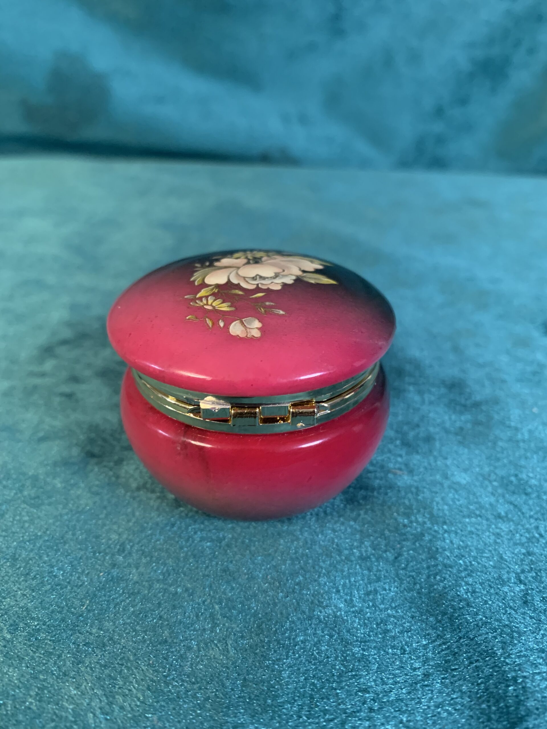 ALHAJERO PASTILLERO DE ALABASTRO, precioso alhajero de alabastro, circular, pintada a mano en policromía de forma bicolor en rojo y negro, con adornos florales, con bisagra y cierre metálico
