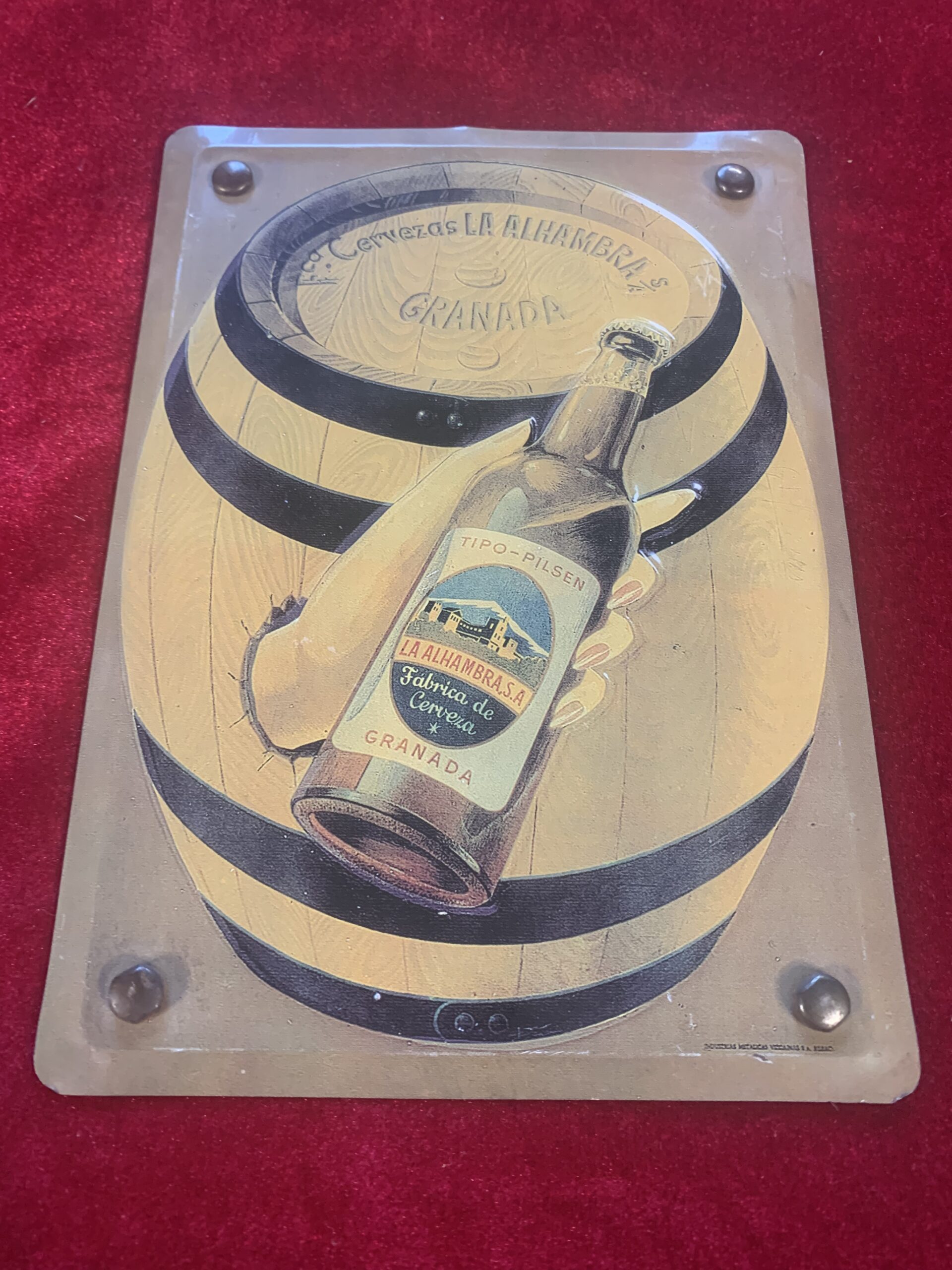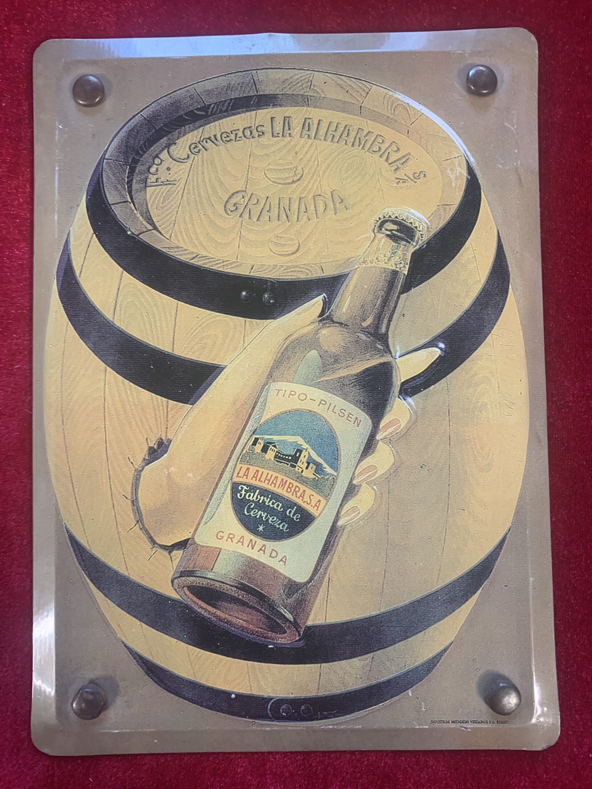 Cartel publicitario Cervezas Alhambra, fabricado en chapa litografiada, con la representación de la marca.